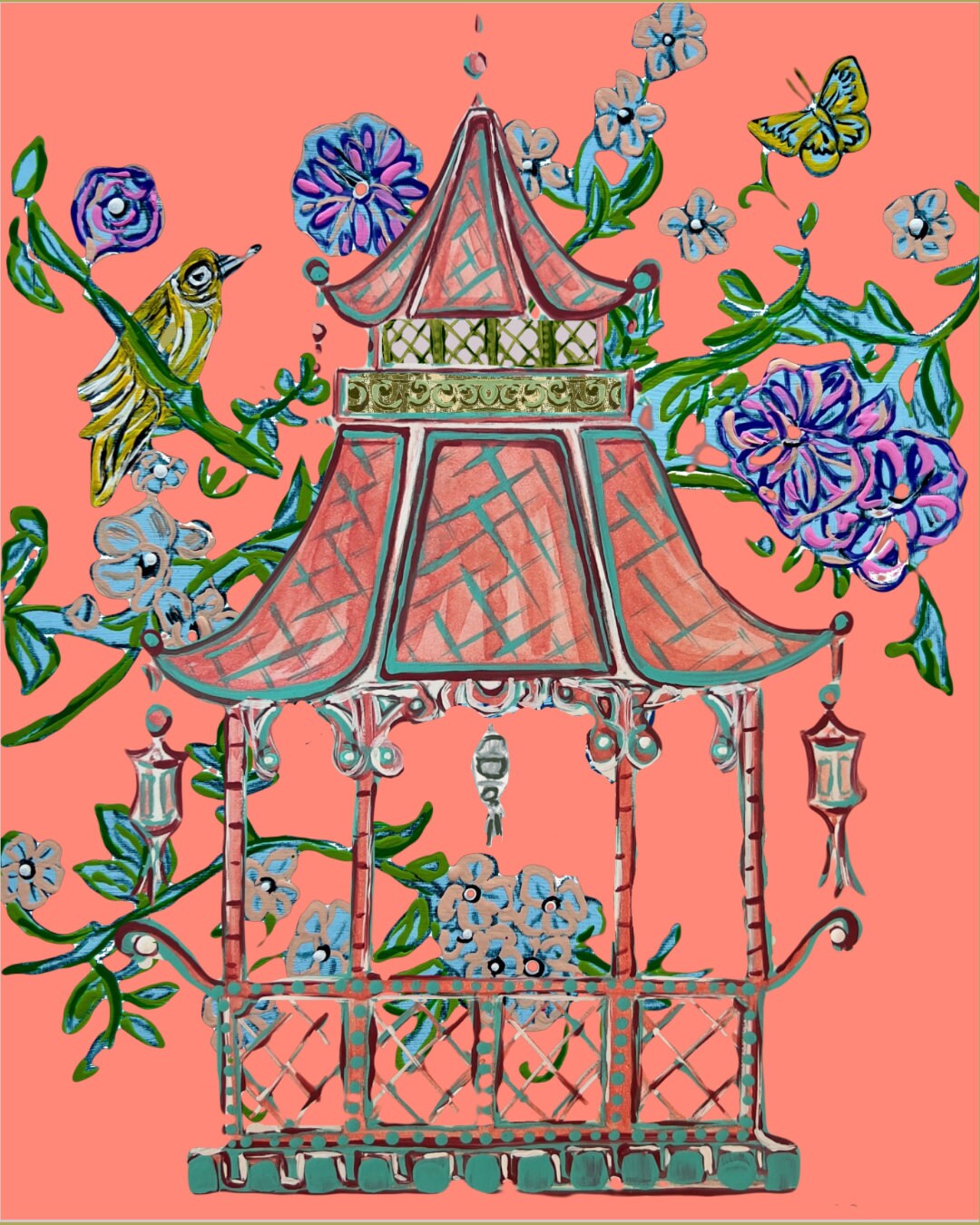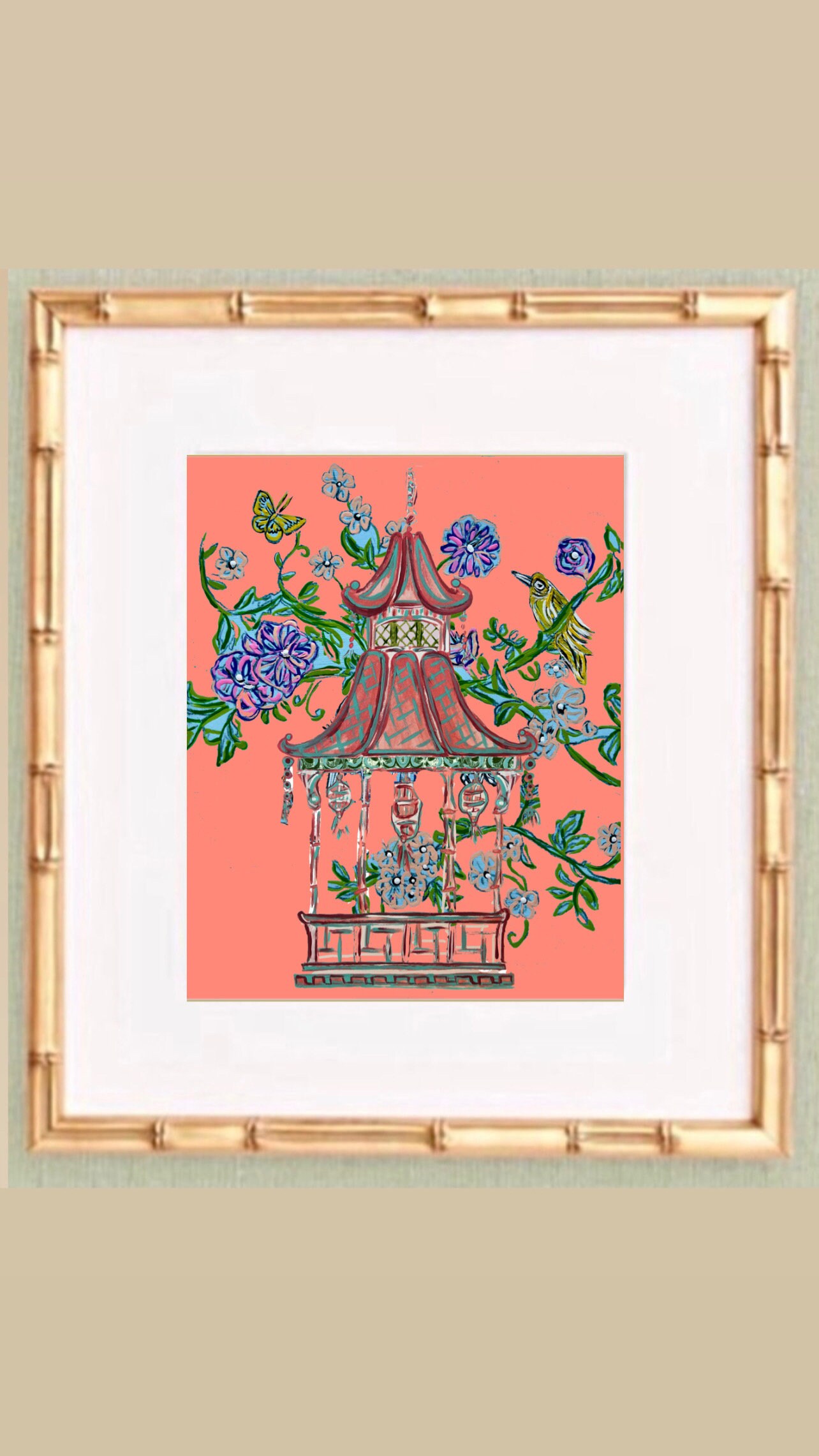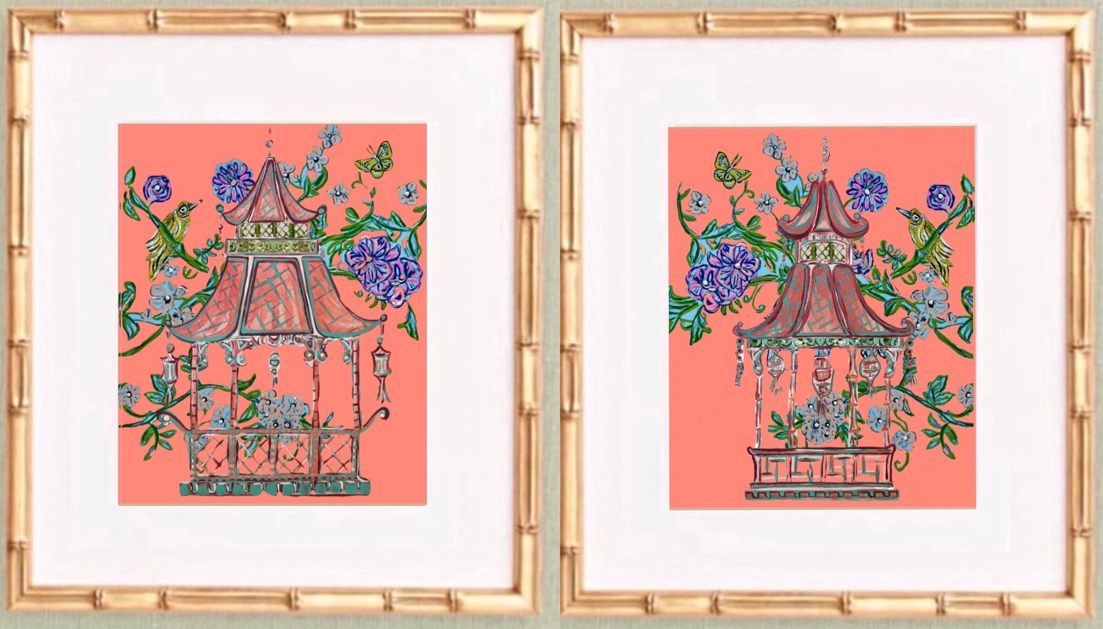 Chinoiserie Pagoda Art Prints: Gold Bamboo Frames, Fine Art Paper (Set of 2)