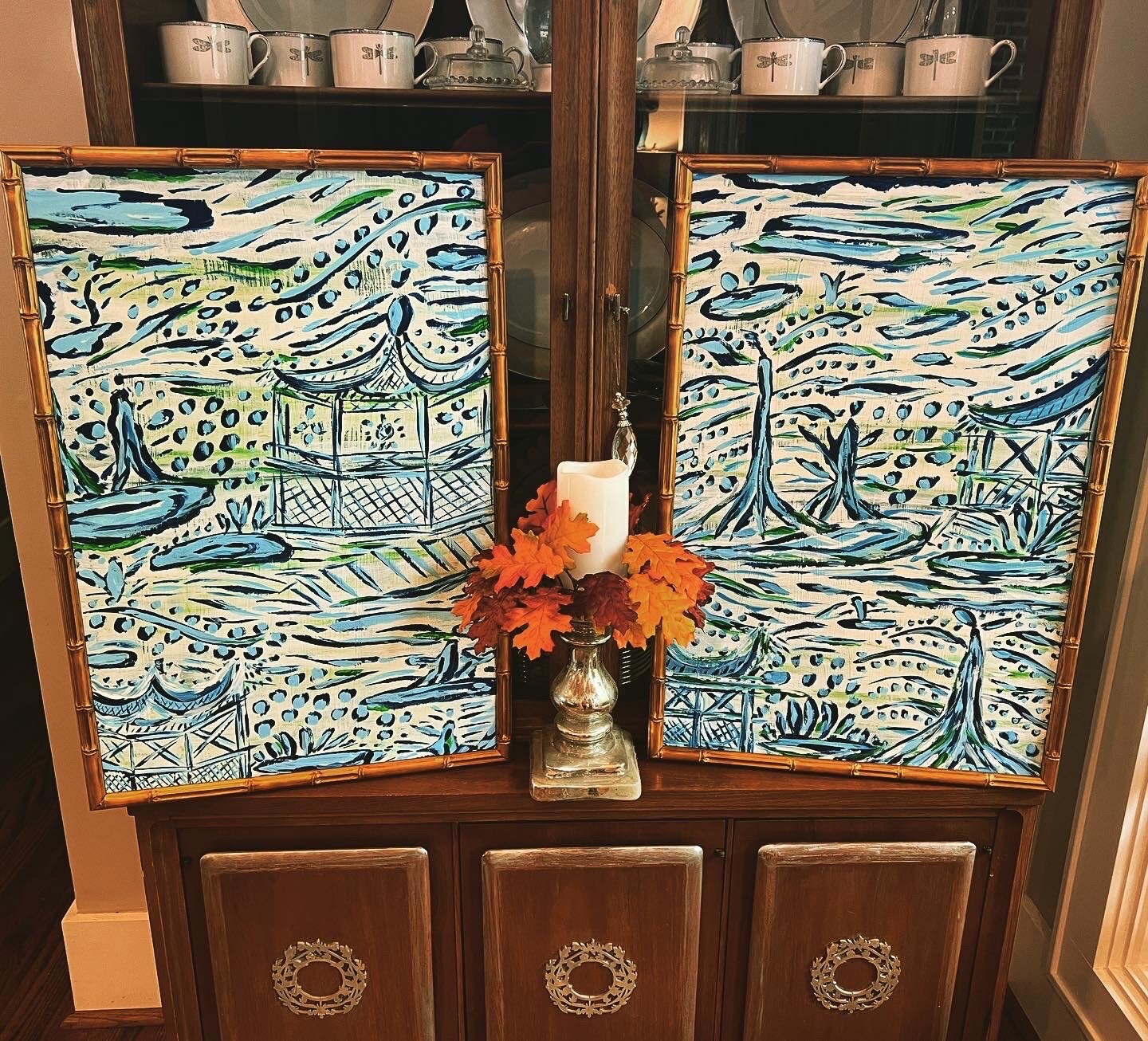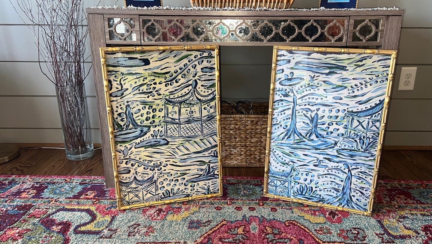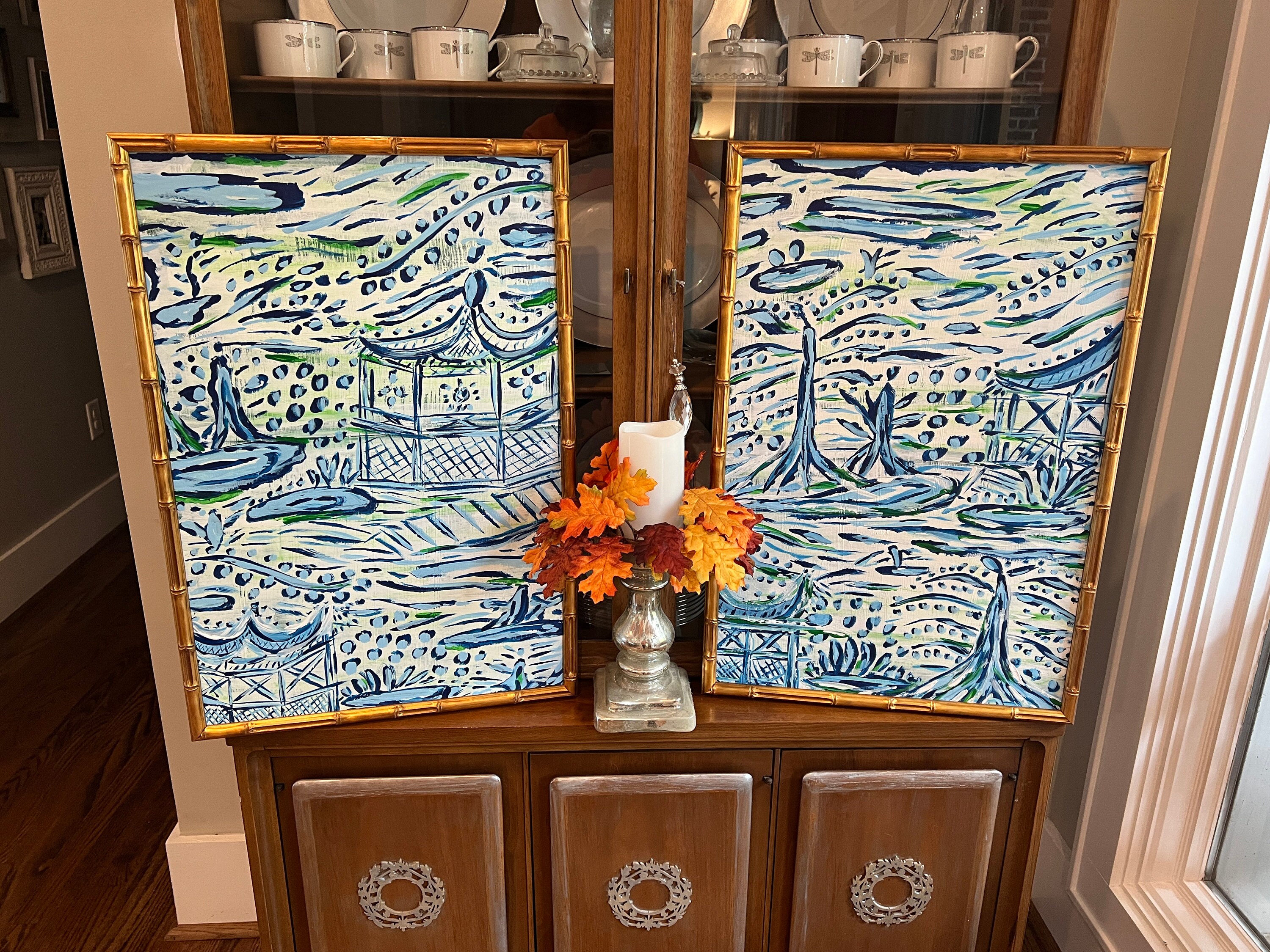 This listing is for the pair of fine art gicleès at 16x24 image size completed in blue, green and white pantones on 16x24 durable canvas paper; and, then framed in these exquisite gilded gold, wooden bamboo frames to 17x25 overall size. Each frame comes ready to hang with real glass fronts (not the cheaper plexi) and wire hangers pre-mounted. The pair is signed on the back, by me, the artist.