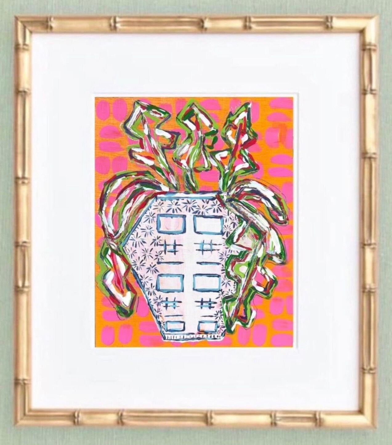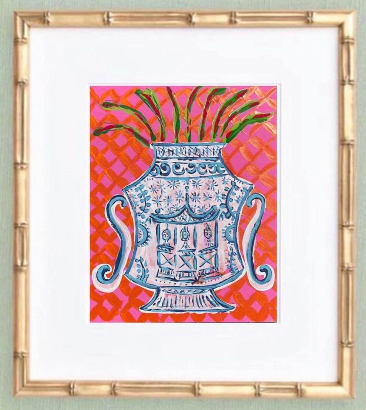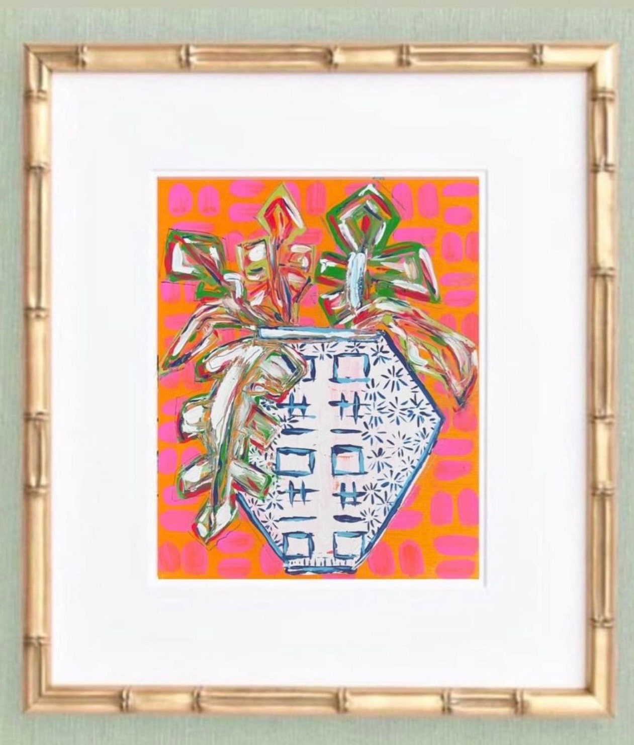 This listing is for the trio of fine art ginger jar on colorful whimsy patterned backgrounds printed on durable canvas paper at 8x10 size; each one is matted in a single bevel white mat to 11x14 size and then framed in these exquisite wooden, gold bamboo frames with real glass fronts at 12x15 overall size. These come ready to hang with metal sawtooth hangers.