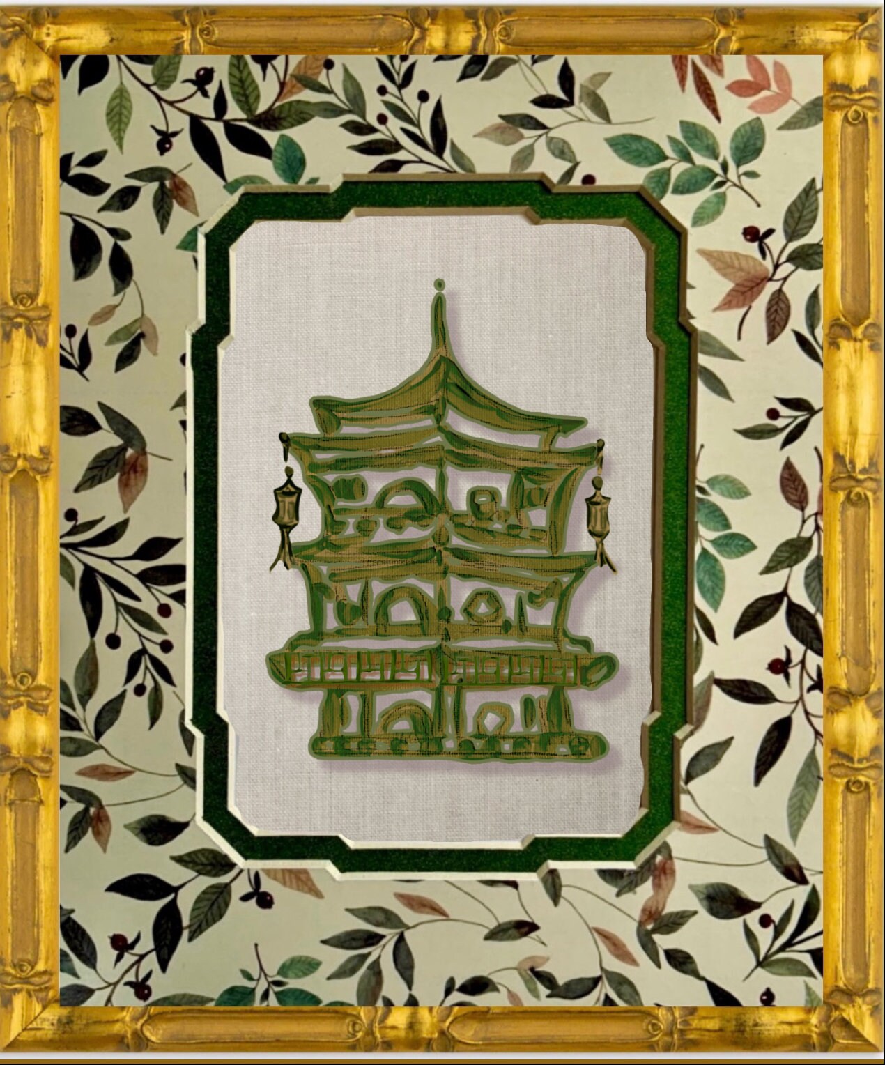 This listing is for the set of four fine art canvas paper prints of posh pagoda houses in a monochromatic green tones on a linen style background printed at 7x10 image size. Then, matted in these exquisite double mats of a floral and vine nature with double cut array on both. Framed in wooden gold bamboo that is gilded in gold leaf at overall dims of 12x15x1.25 each.