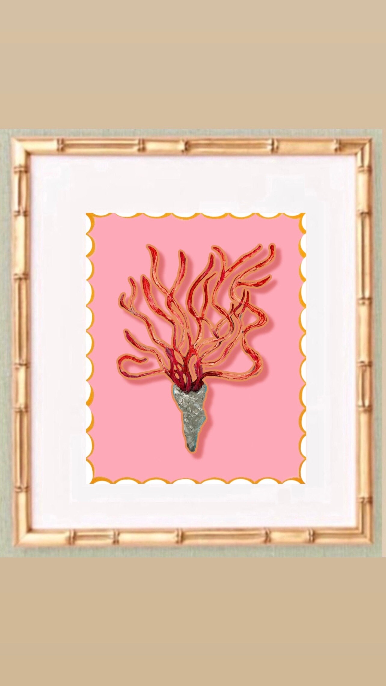 Pair of Fine Art Coral Prints Single Matted in White and Framed in Gold Bamboo