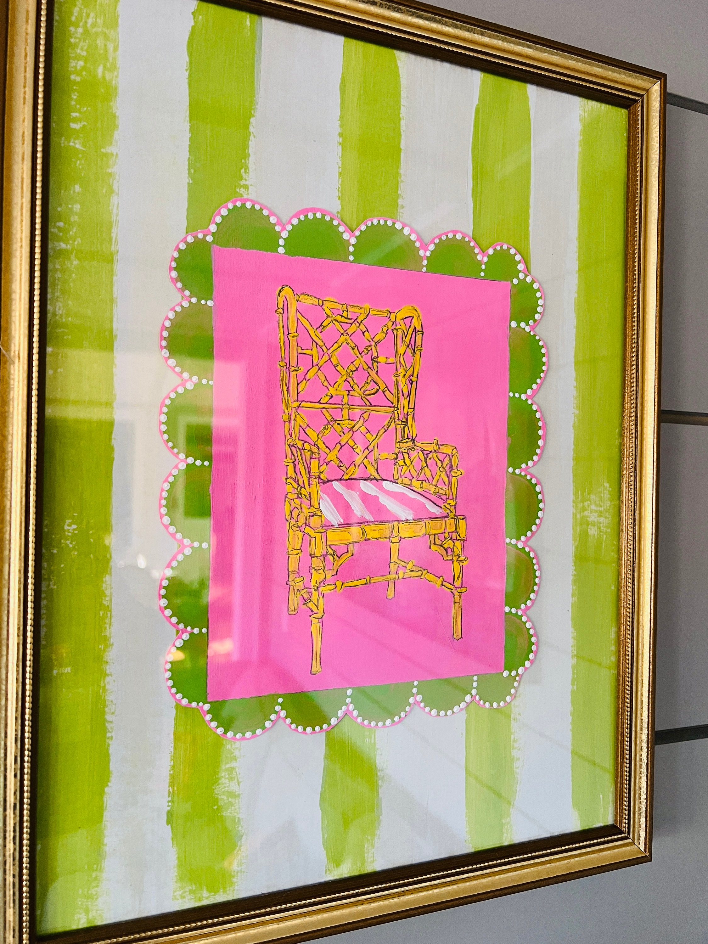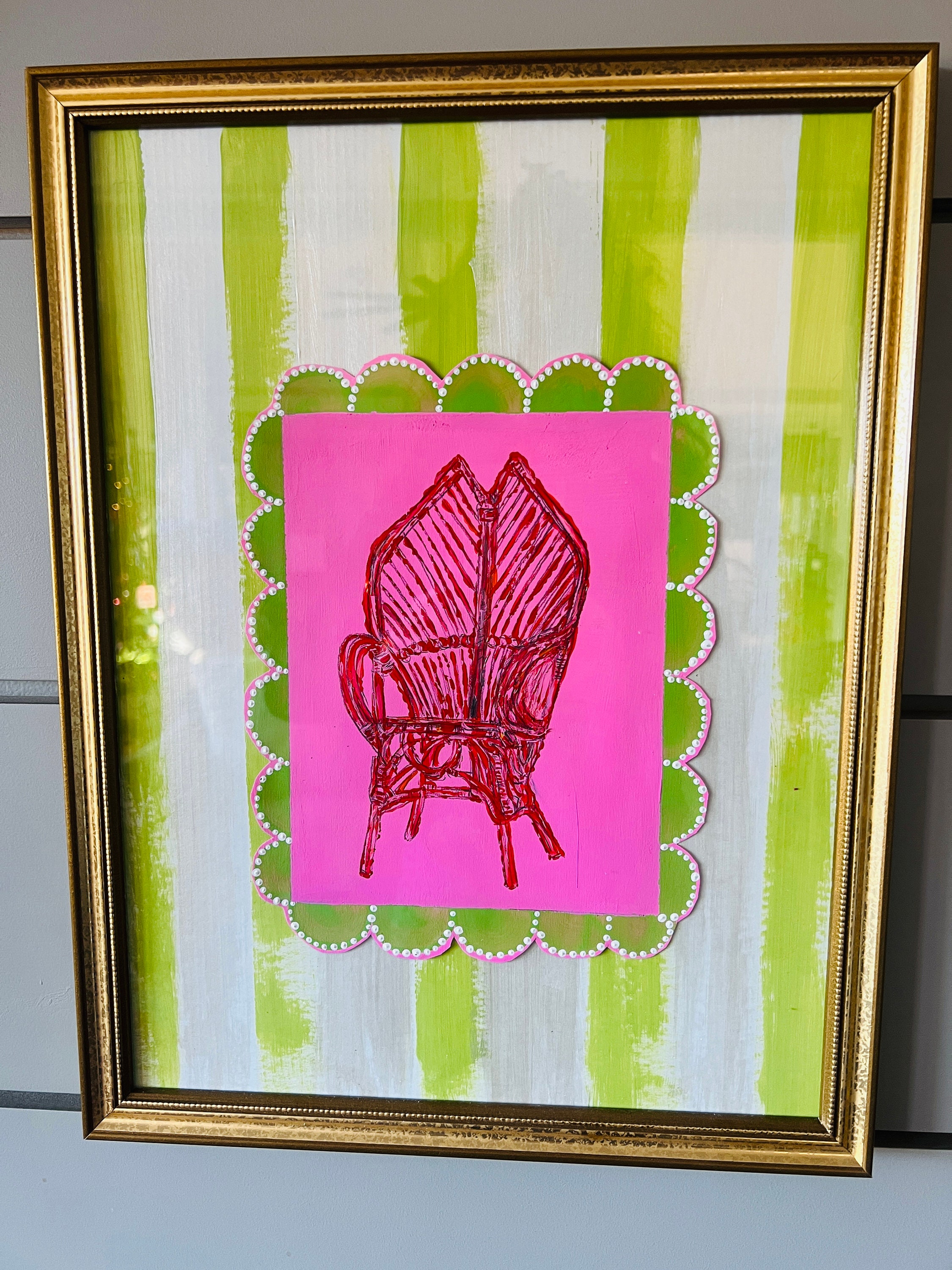 This listing is for the set of four fine art vintage rattan/bamboo chair prints on 12x16 canvas paper. The background is a green and oyster stripe with a scalloped pink and green and pearlized style white dot ultra chic ‘frame’ around the four styles of chairs: the Peacock, an Art Deco, a Fern Palm Style, and lastly the Bamboo/Chinois chair.