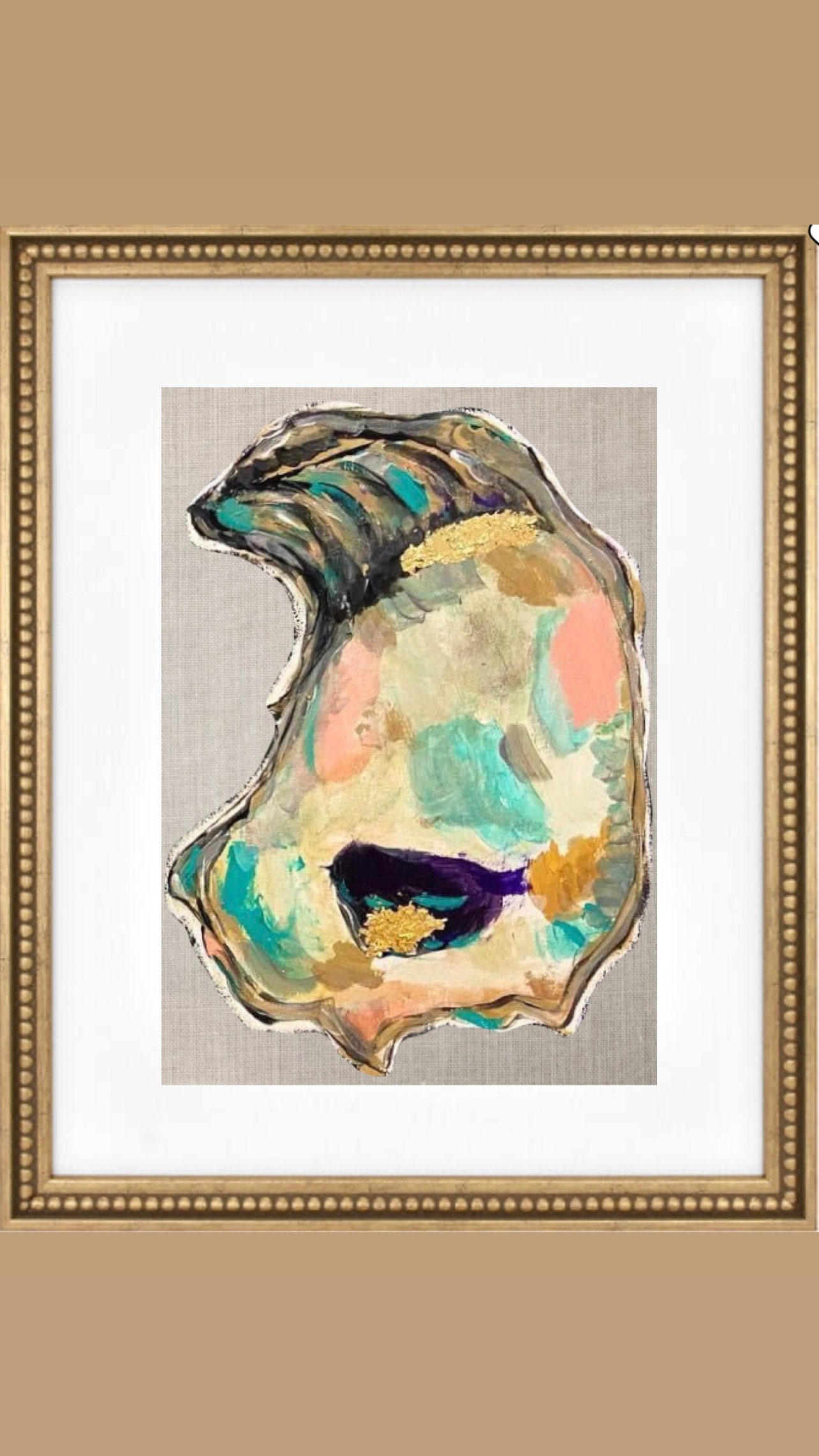 This listing is for the trio of fine art canvas paper oyster gicleès at 11x14 image size; matted with a single bevel white mat at 16x20 and then framed in these exquisite gold beaded frames at 17x21x1.25. Each frame comes ready to hang and has real glass fronts. These beautiful frames are made of wood and come adorned with gold-toned beads for added charm.