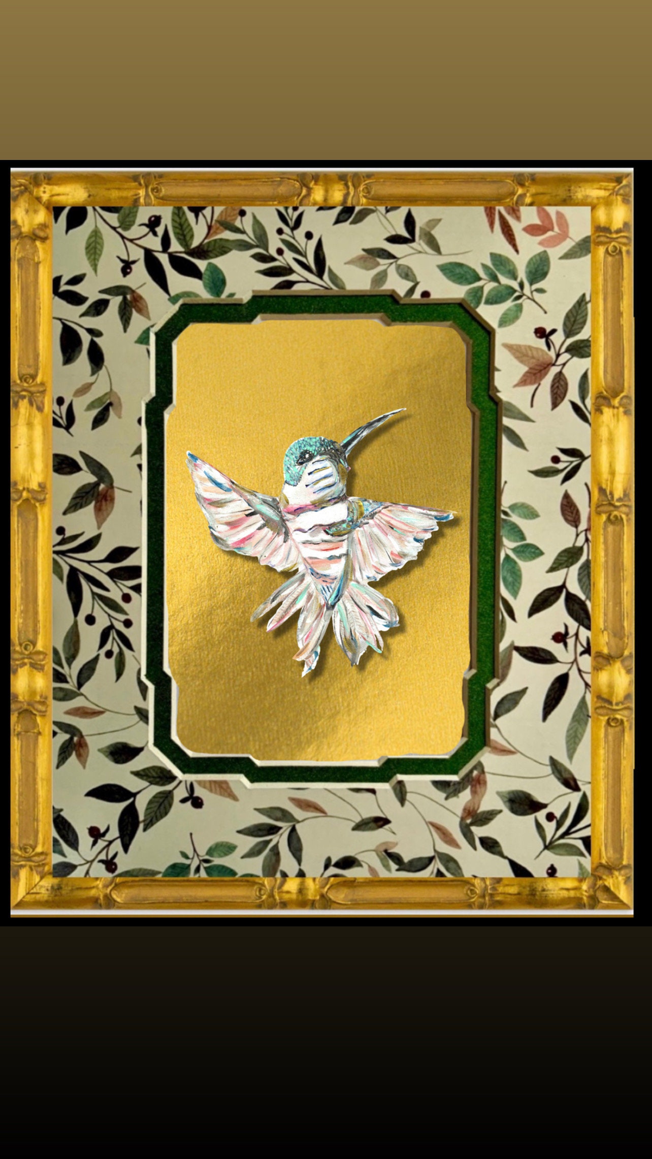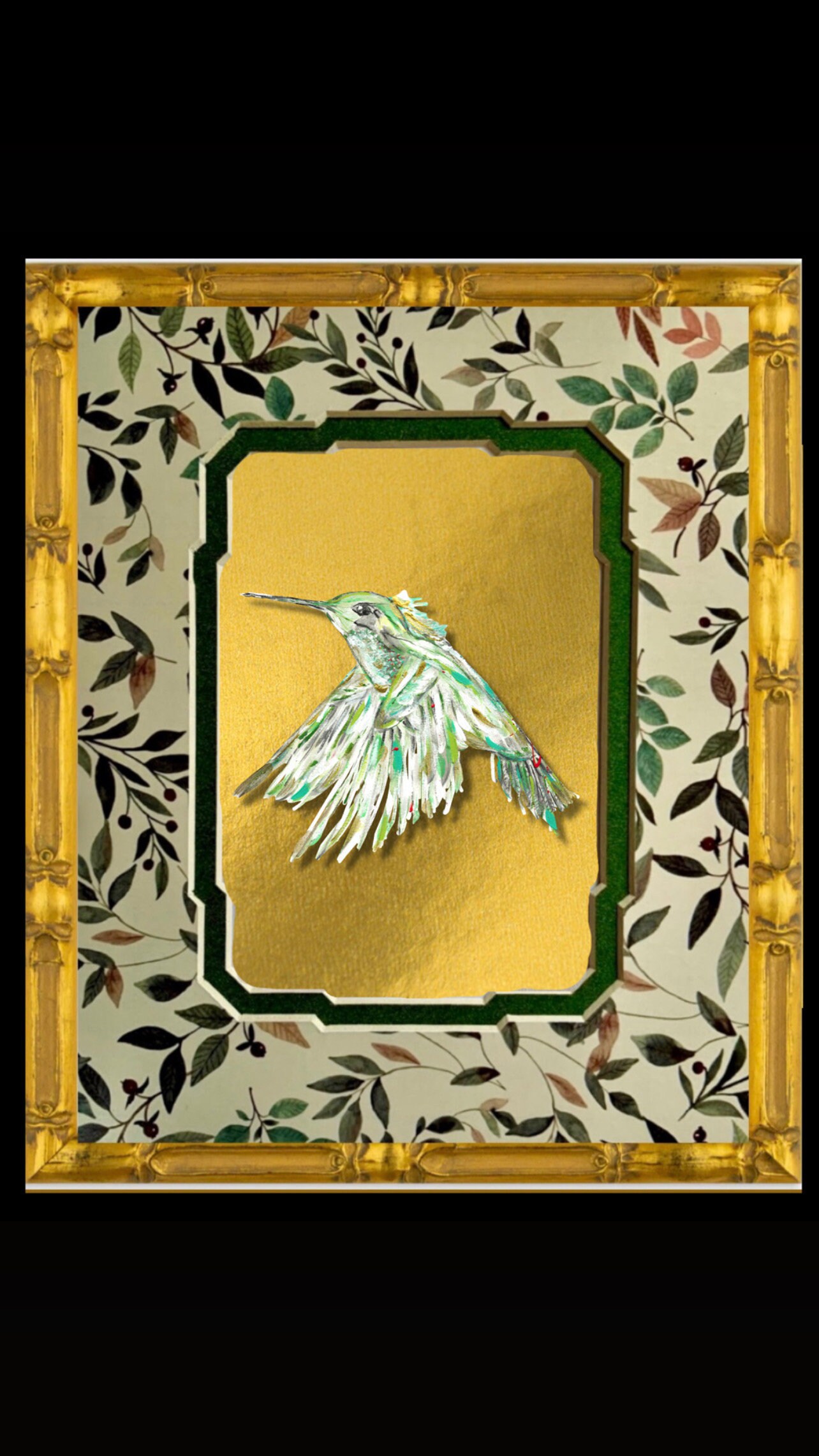 This listing is for the set of four fine art canvas paper hummingbird prints at 7x10 image size and then double matted in this exquisite vine pattern mat with double cut intricate array pattern. All come framed in these gorgeous gilded leaf, wooden, gold bamboo frames at overall dims of 12x15x1.25. Frames come ready to hang with real glass fronts and metal sawtooth hangers on the back.