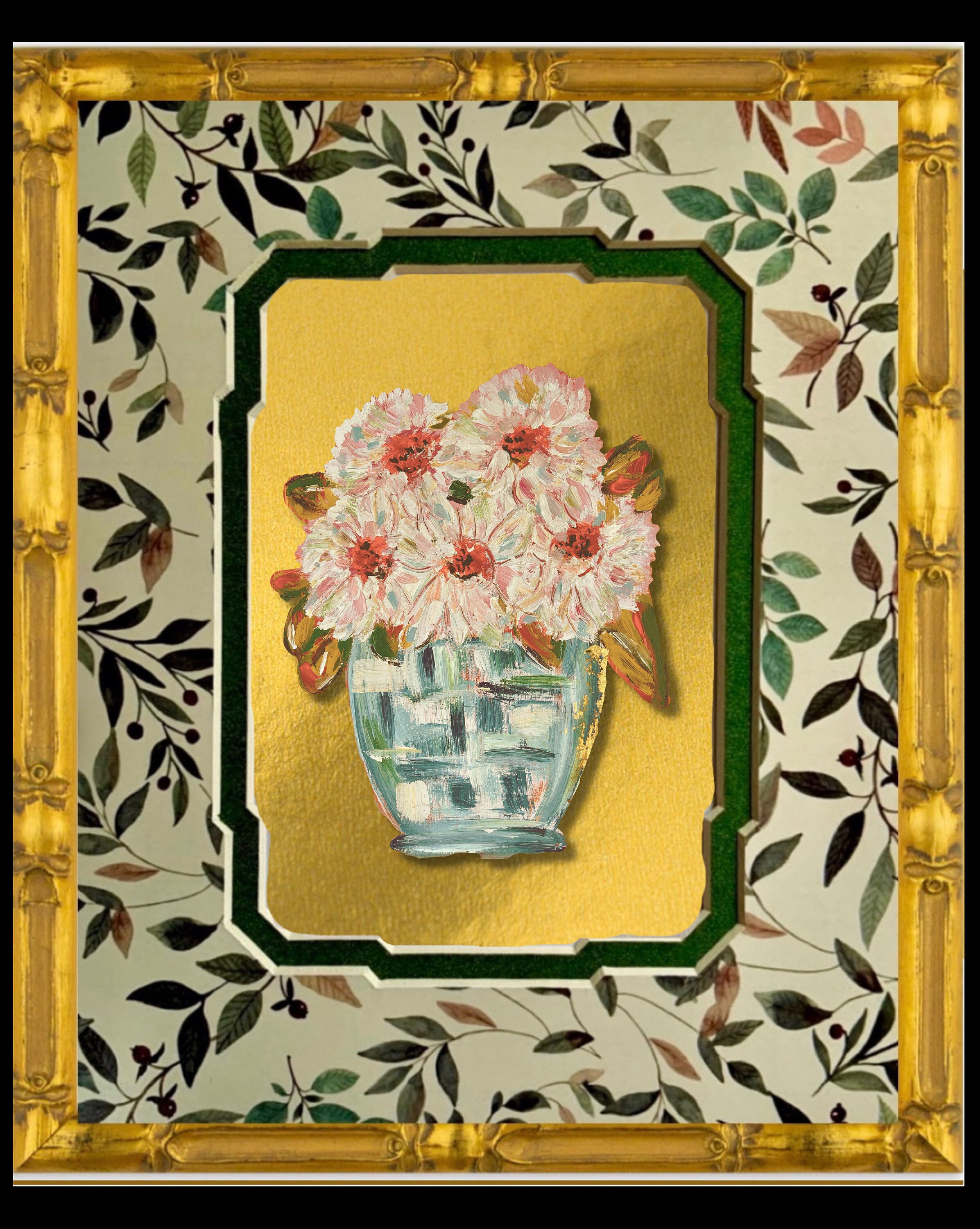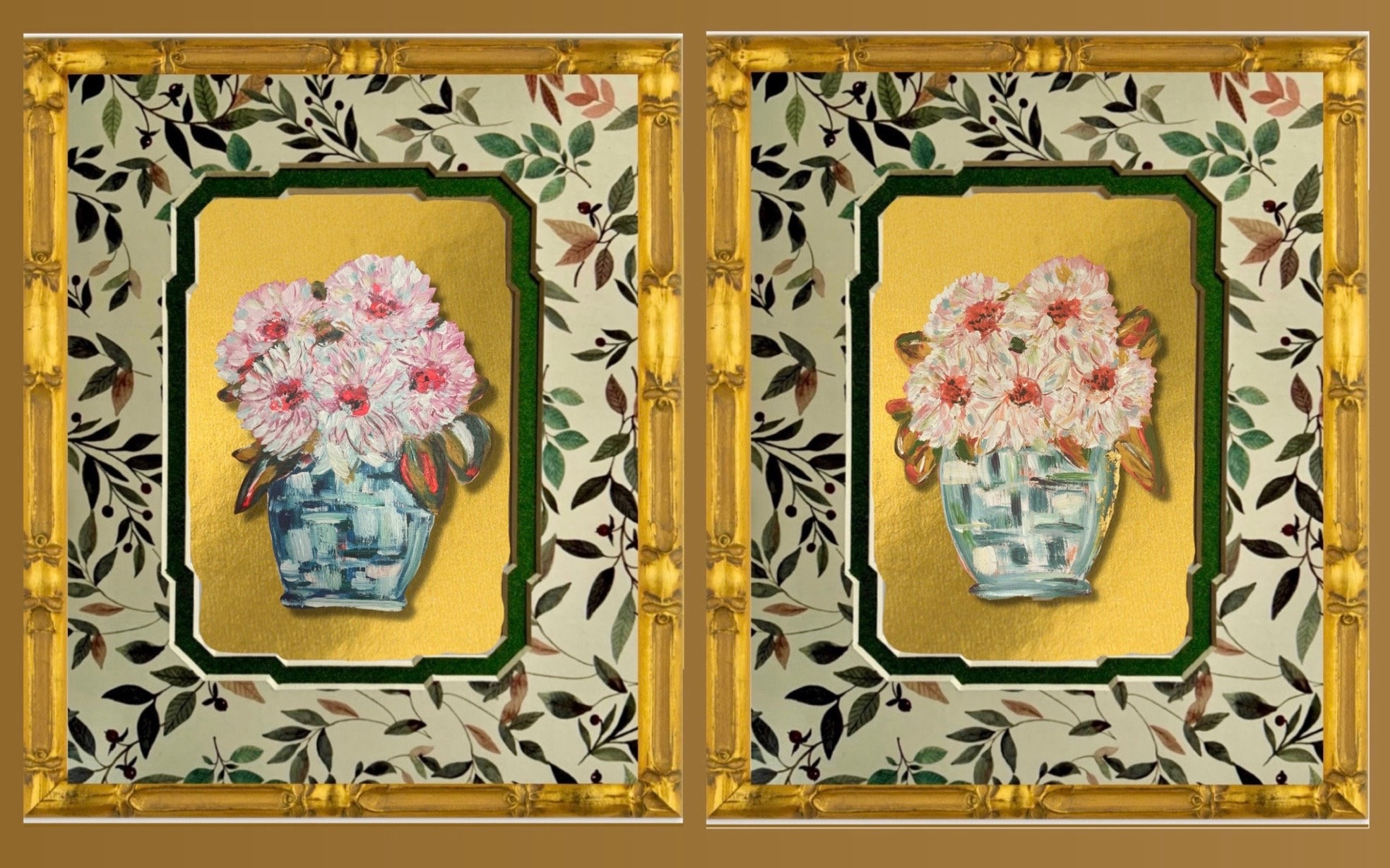 This listing is for the pair of fine art canvas paper prints of posh florals in ginger jar vases set on a gold foil aesthetic/style background printed at 7x10 image size. Then, matted in these exquisite double mats of a floral and vine nature with double cut array on both. Framed in wooden gold bamboo that is gilded in gold leaf at overall dims of 12x15x1.25 each.