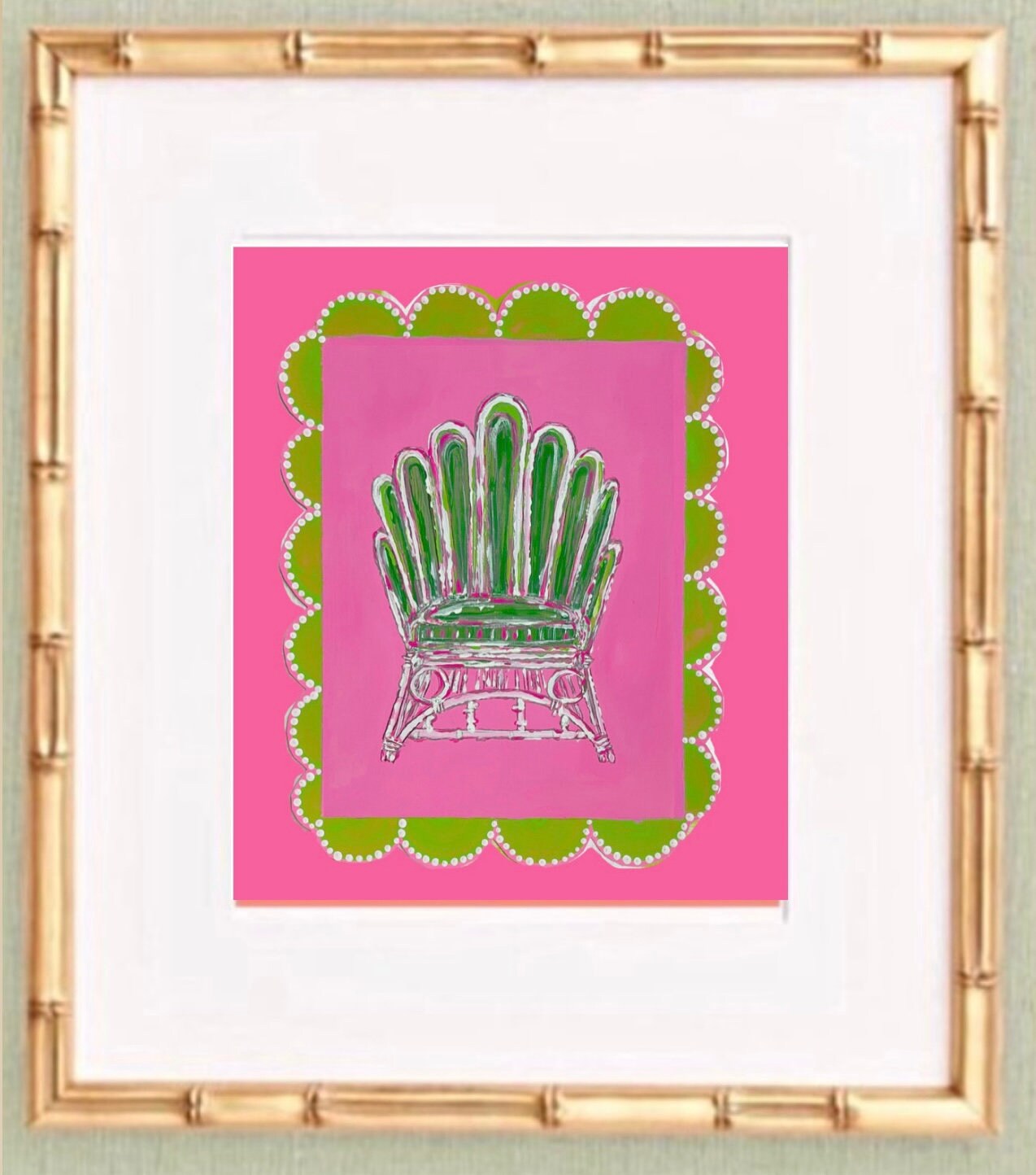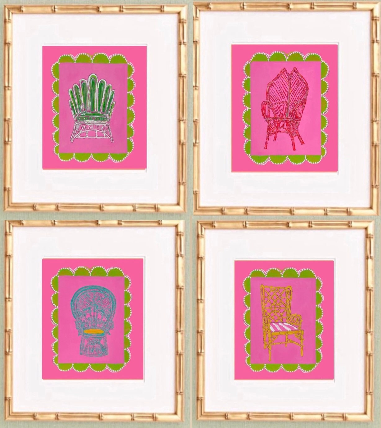 Set of four fine art canvas paper prints sized at 8x10 image size each; matted in a single bevel white mat at 8x10 to 11x14 size. Then, framed in these exquisite gilded gold leaf wooden bamboo frames at 12x15x1.25. These come ready to hang with real glass fronts and a single metal sawtooth hanger on the backs of each frame.