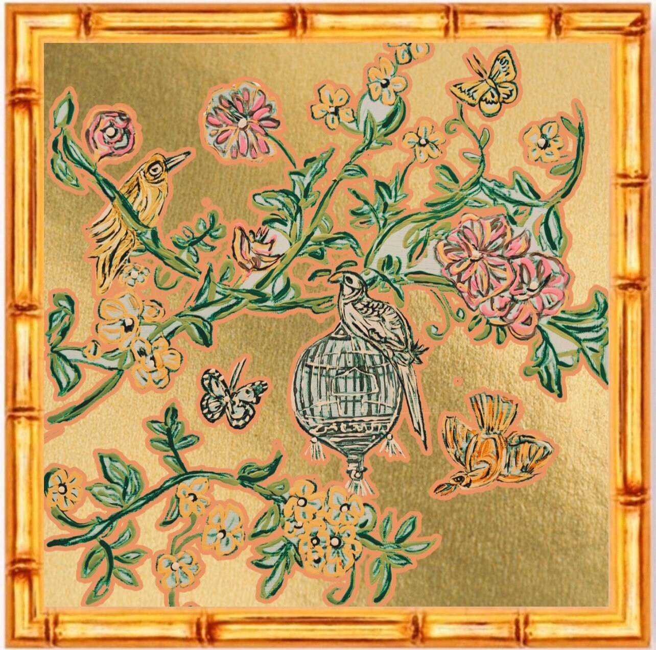 This listing is for the pair of fine art canvas paper prints on a gold aesthetic/style background at 20x20 image size; framed in exquisite gilded gold leaf wooden bamboo frames with real glass fronts. These come ready to hang with pre-mounted wire hangers.