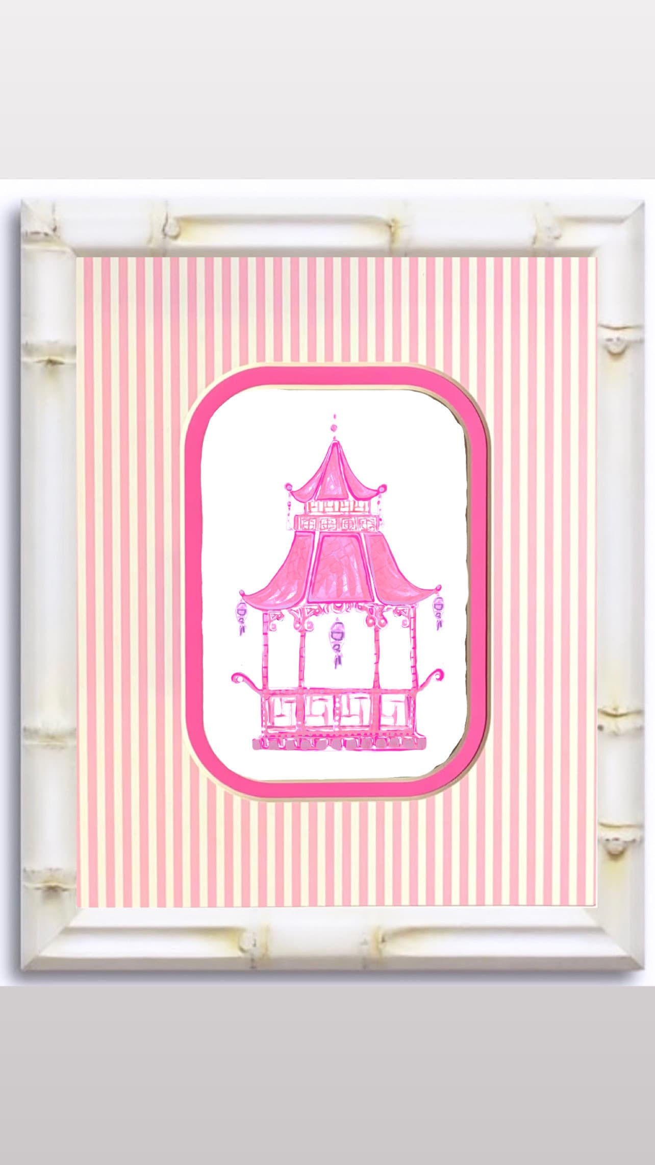 This listing is for the pair of fine art pagoda prints in either pink or blue. The pink set comes with pink/white striped double mat. The blue set comes with a blue/white striped double mat.