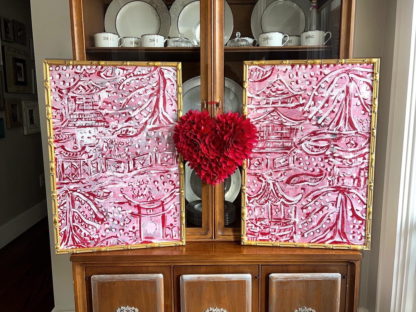 This listing is for the pair of originals at 16x24 image size completed in acrylic paint in pinks, crimson red,and white pantones on 16x24 poplar wood which provides tons of texture throughout; and, then framed in these exquisite gilded gold, wooden bamboo frames to 17x25 overall size. Each frame comes ready to hang with real glass fronts (not the cheaper plexi) and metal sawtooth hangers. The originals are signed; titled; dated on the back.