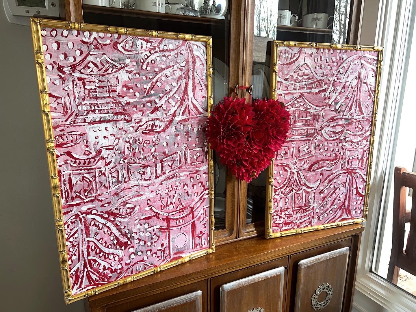 Pair of Chinoiserie Abstract Crimson and Pink Originals Framed to 17x25 Each