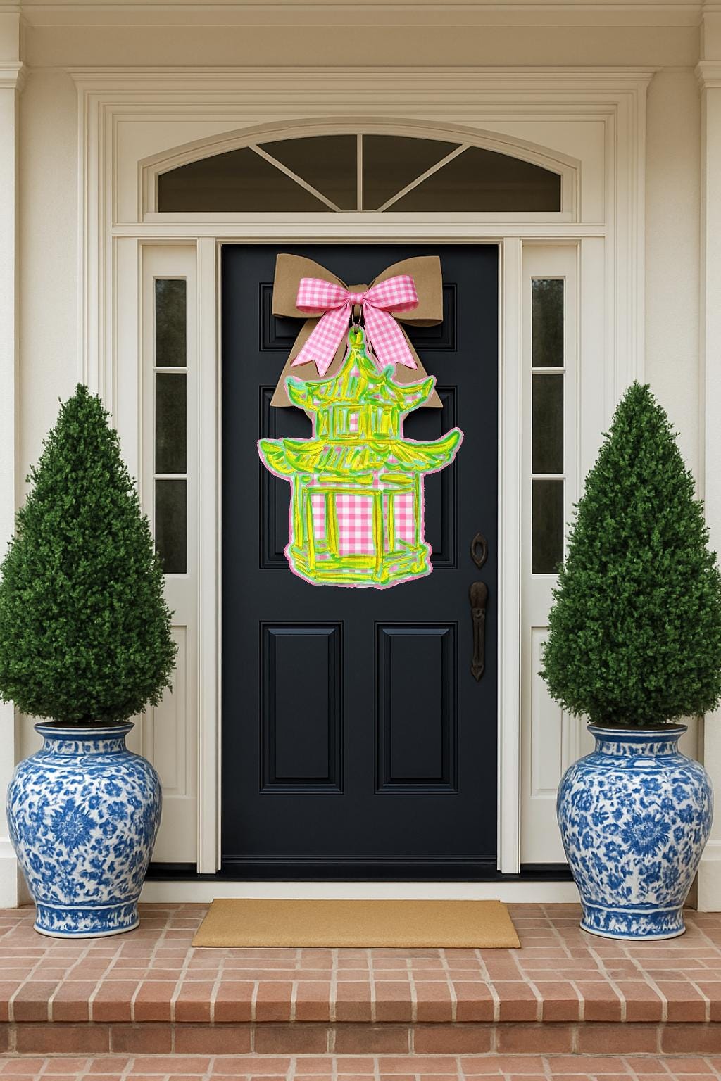 This listing is for the single larger door hanger at 28” height and 22”width made from 6mm PVC board. This hanger is perfect for exterior use as it’s resistant to fading from UV sunlight. Printed application with full color spectrum printer. Comes with a 1/2” drilled hole on center at the top for hanging purposes.