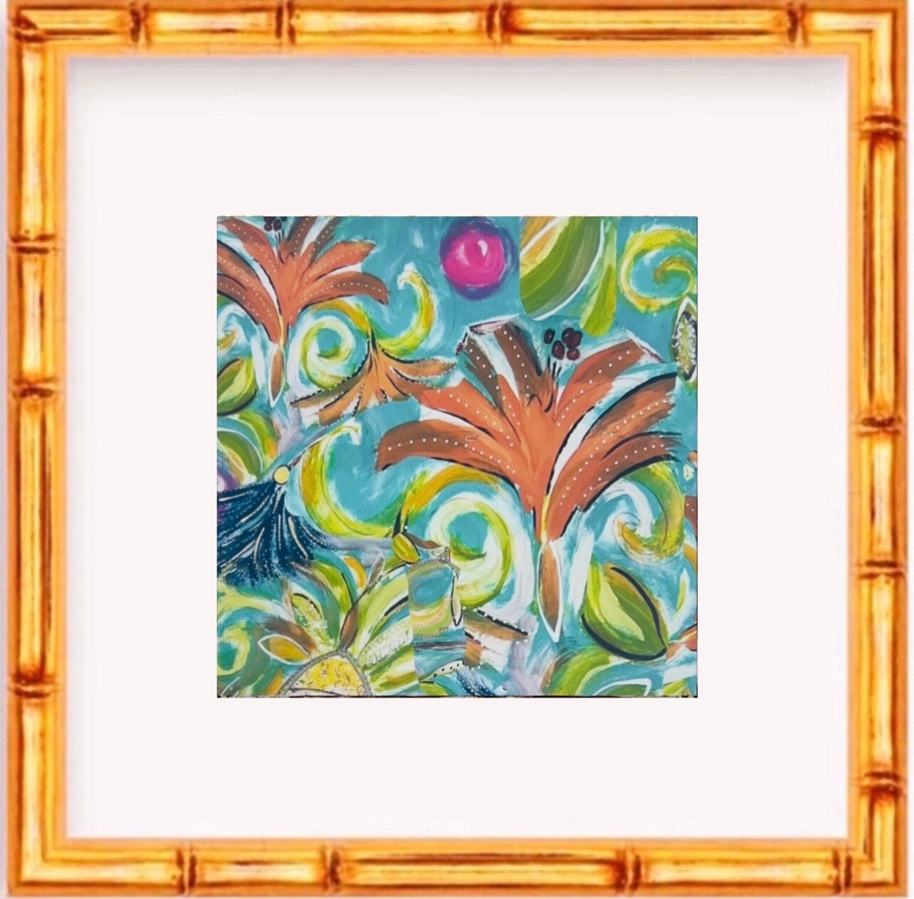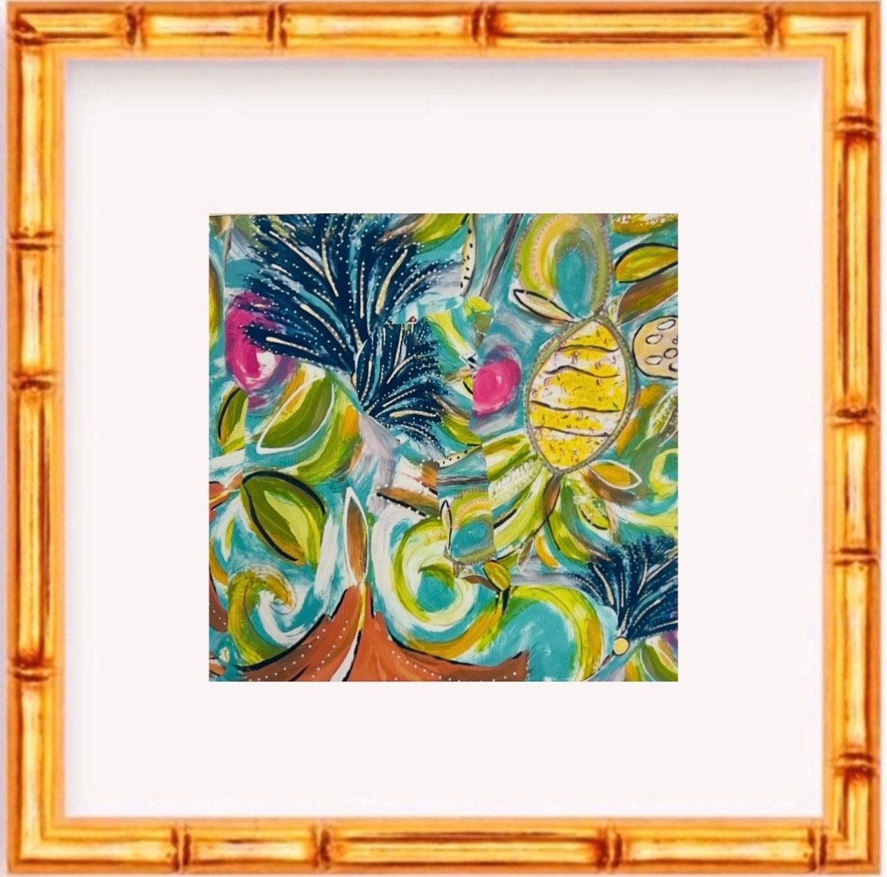 This listing is for the set of four fine art canvas paper gicleè prints at 8x8 image size matted with a single bevel white mat at 12x12 and then framed in these exquisite gilded gold leaf bamboo frames at 13x13 overall size. These frames come ready to hang with metal sawtooth hangers and real glass fronts.