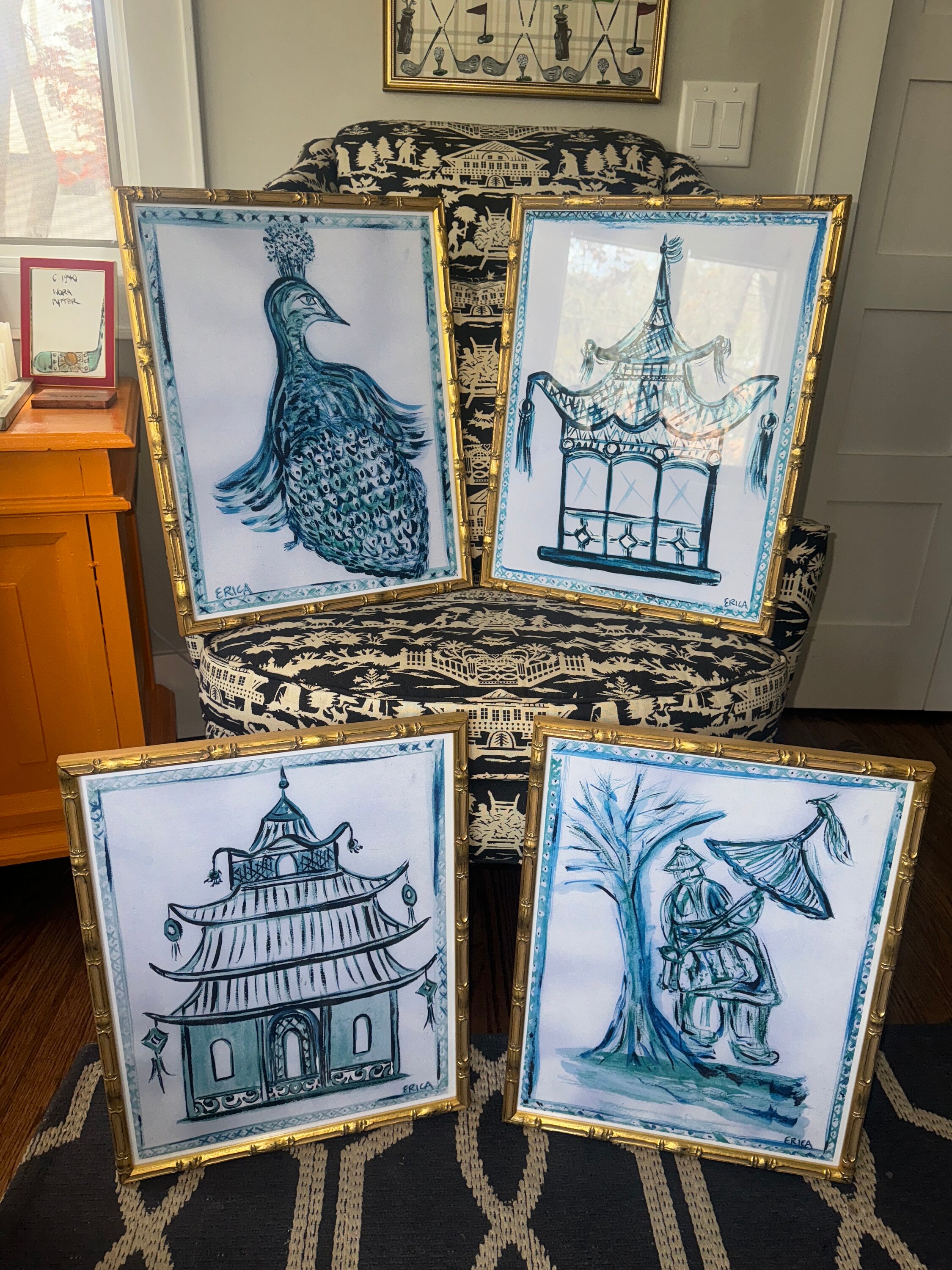 This listing is for the set of four fine art 130lb artist’s paper prints of pagodas on blue linear background border paper sized at 14x18; framed in these exquisite gilded gold leaf bamboo frames at 15x19x1.25. These come ready to hang with a single metal sawtooth hanger on the back and real glass fronts.