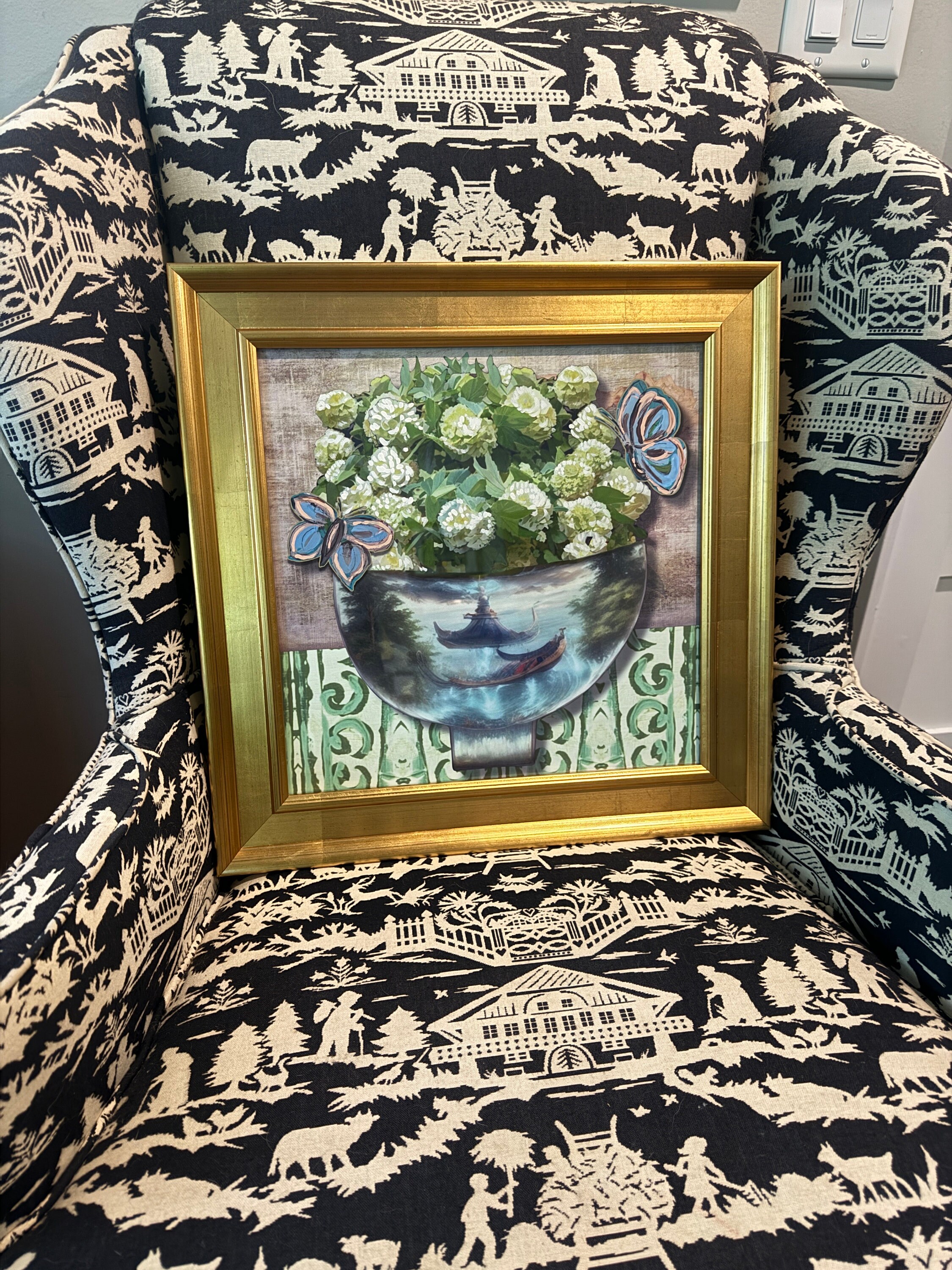 This fun and whimsical Chinois Floral Fine Art Canvas Paper Print in Ginger Jar is sure to brighten your space! Comes ready to hang at 19x19x2 overall dims framed in gilded gold leaf wide moulding wooden frame with real glass front and metal sawtooth hangers.