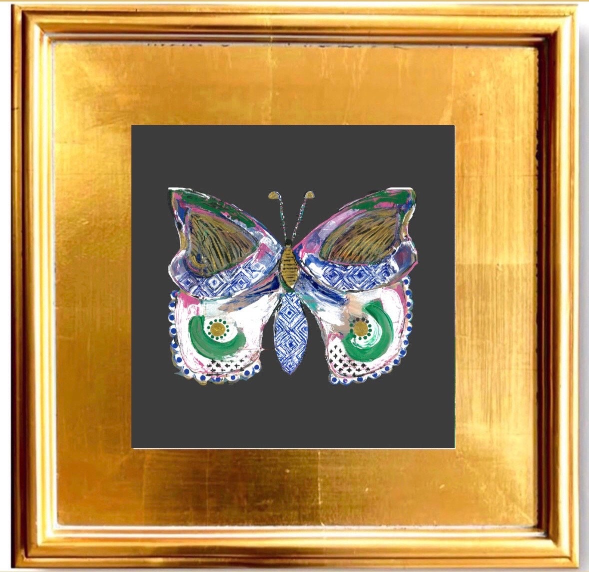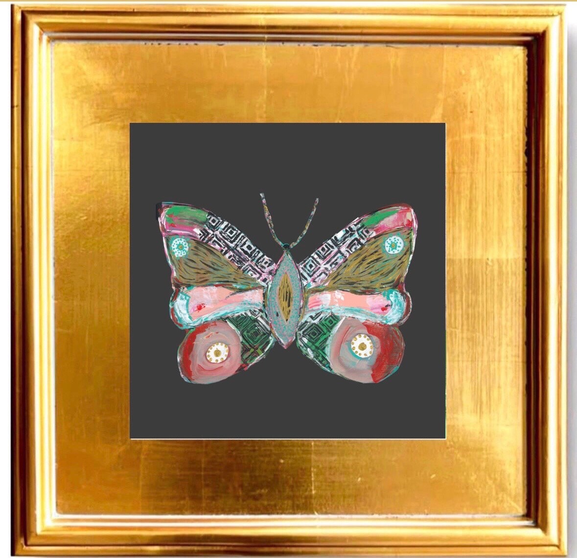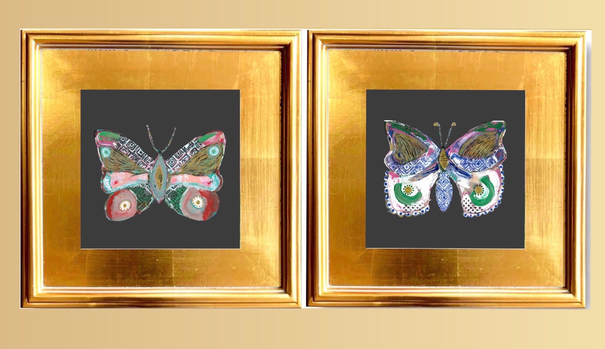This pair of whimsical patterned butterfly Fine Art Canvas Paper Prints on a moody background color aesthetic and then framed in gilded gold are sure to your enhance your space! These come ready to hang at 19x19x2 overall dims framed in gilded gold leaf wide moulding wooden frames with real glass fronts and metal sawtooth hangers.