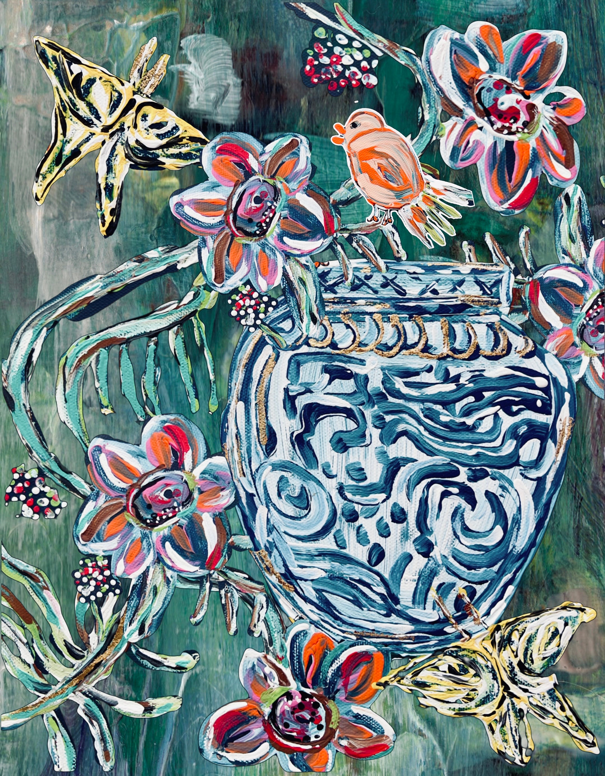 Floral Ginger Jar Art Print: Gold Leaf Frame, Signed Canvas Paper