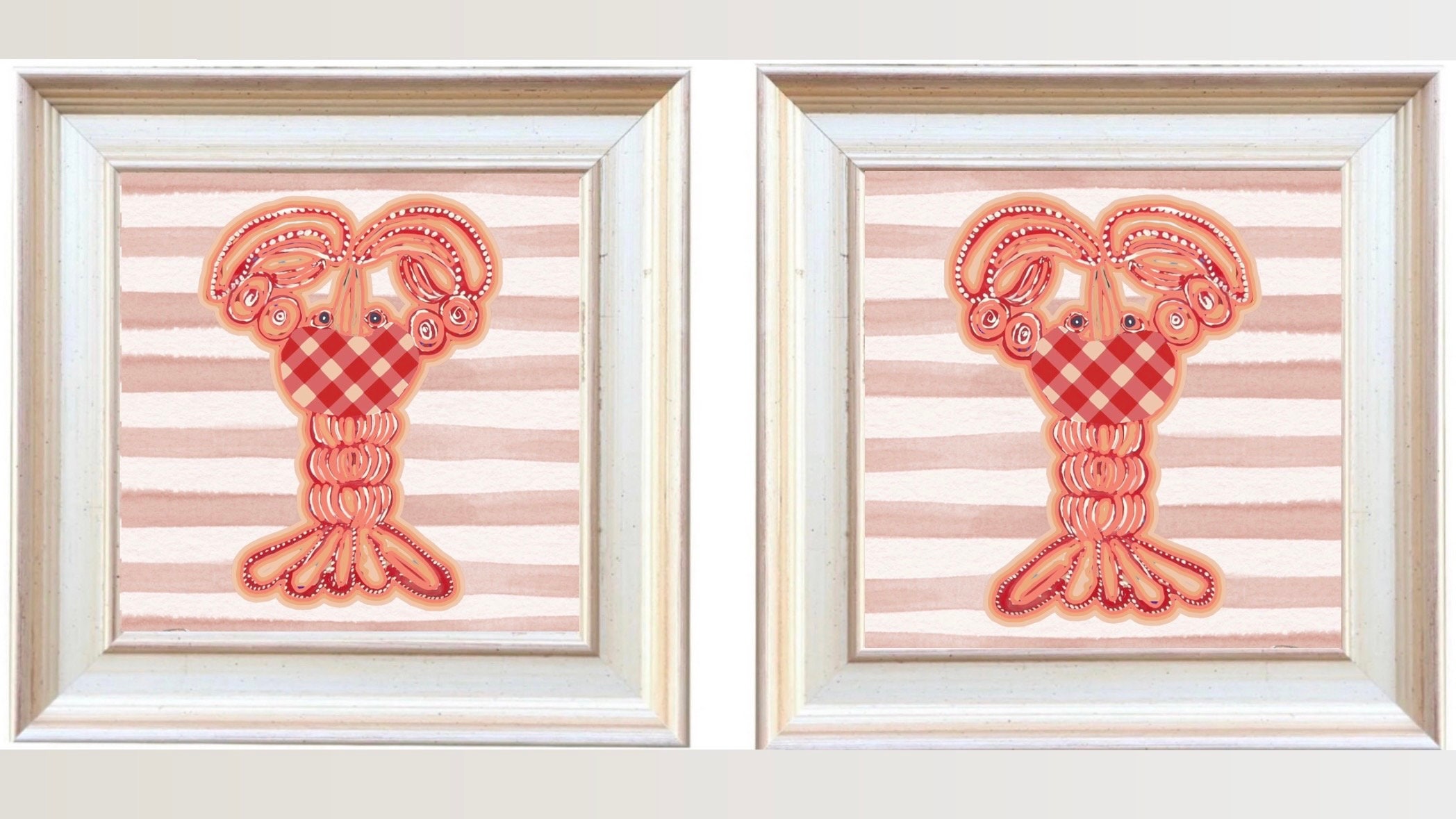 This listing is for the pair of fine art paper lobster prints on striped background. The prints are printed on heavy-weight, acid free, matte paper at 10x10 image size. Each print is signed on the back by me, the artist.