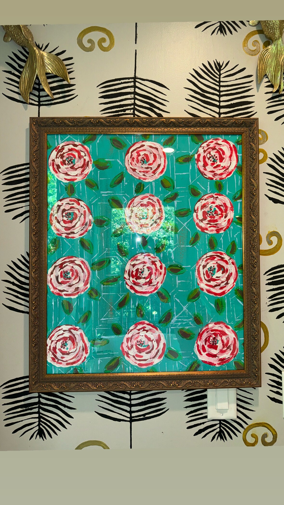 This listing is for the single fine art painting titled “Wall Floral Pom Poms” complete with a Chinois lattice style aesthetic background. Painted using acrylic paints on rigid cardboard; there is so much definition, vibrancy and color in this one.