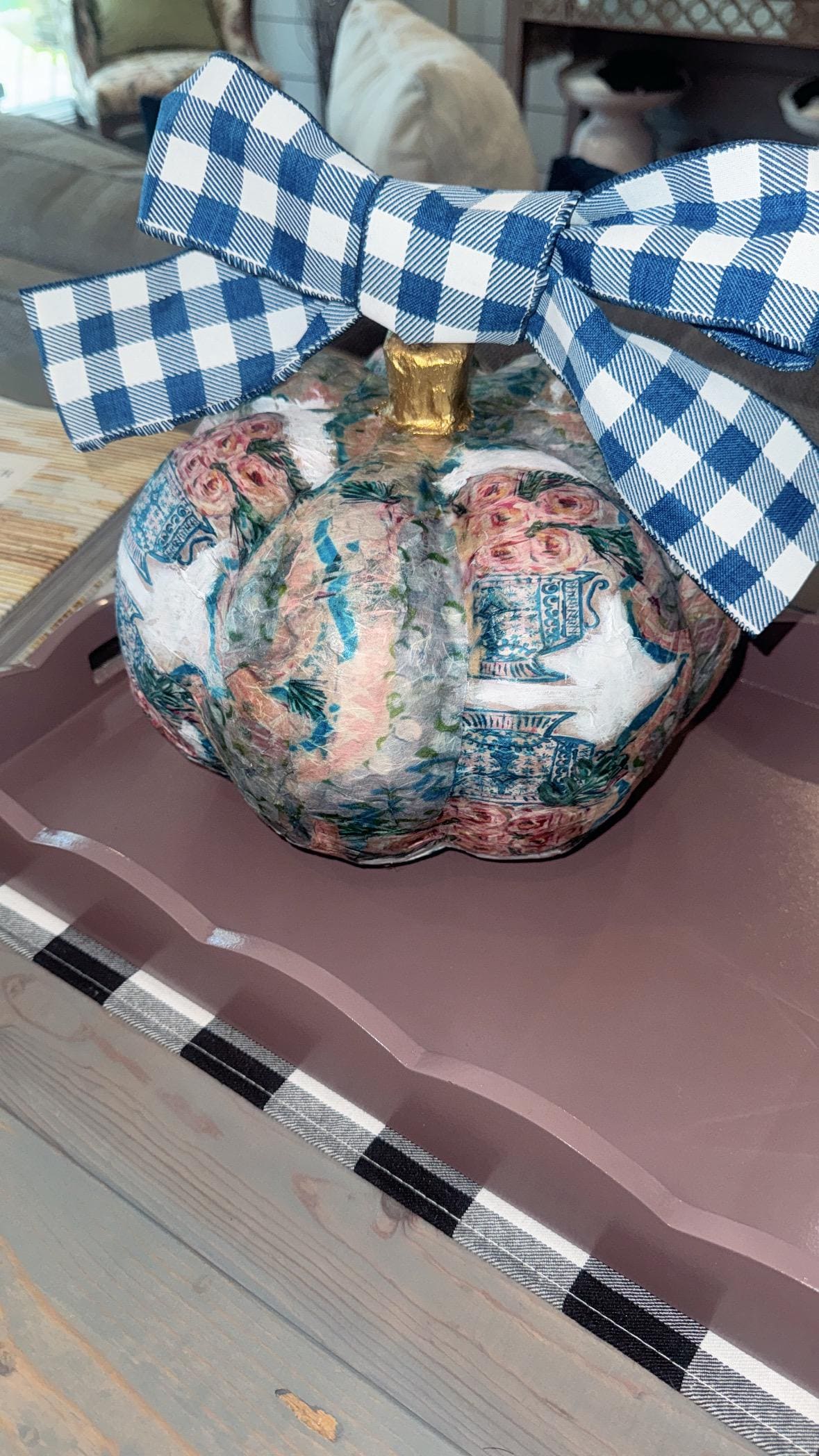 This listing is for the single decorative decoupaged pumpkin at approximately 9” height and 13” diameter. These pumpkins have mulberry paper applied with a design that I hand-painted and scanned in at high-resolution and print on the paper specifically for decoupaging. I hand paint the stems in 14k liquid gold. I have two bow options to choose from.