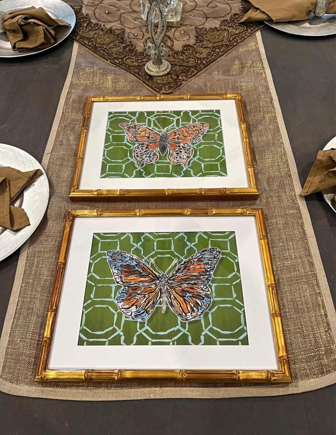 This listing is for the pair of ‘CHINOIS BUTTERFLIES” fine art prints printed on 11x14 canvas paper and then framed in wooden gold bamboo frames to 12x15 each. Each one is matted in a single bevel white mat from 8x10 to 11x14. These frames are exquisite and come ready to hang with sawtooth hanger and real glass fronts (not plexi).