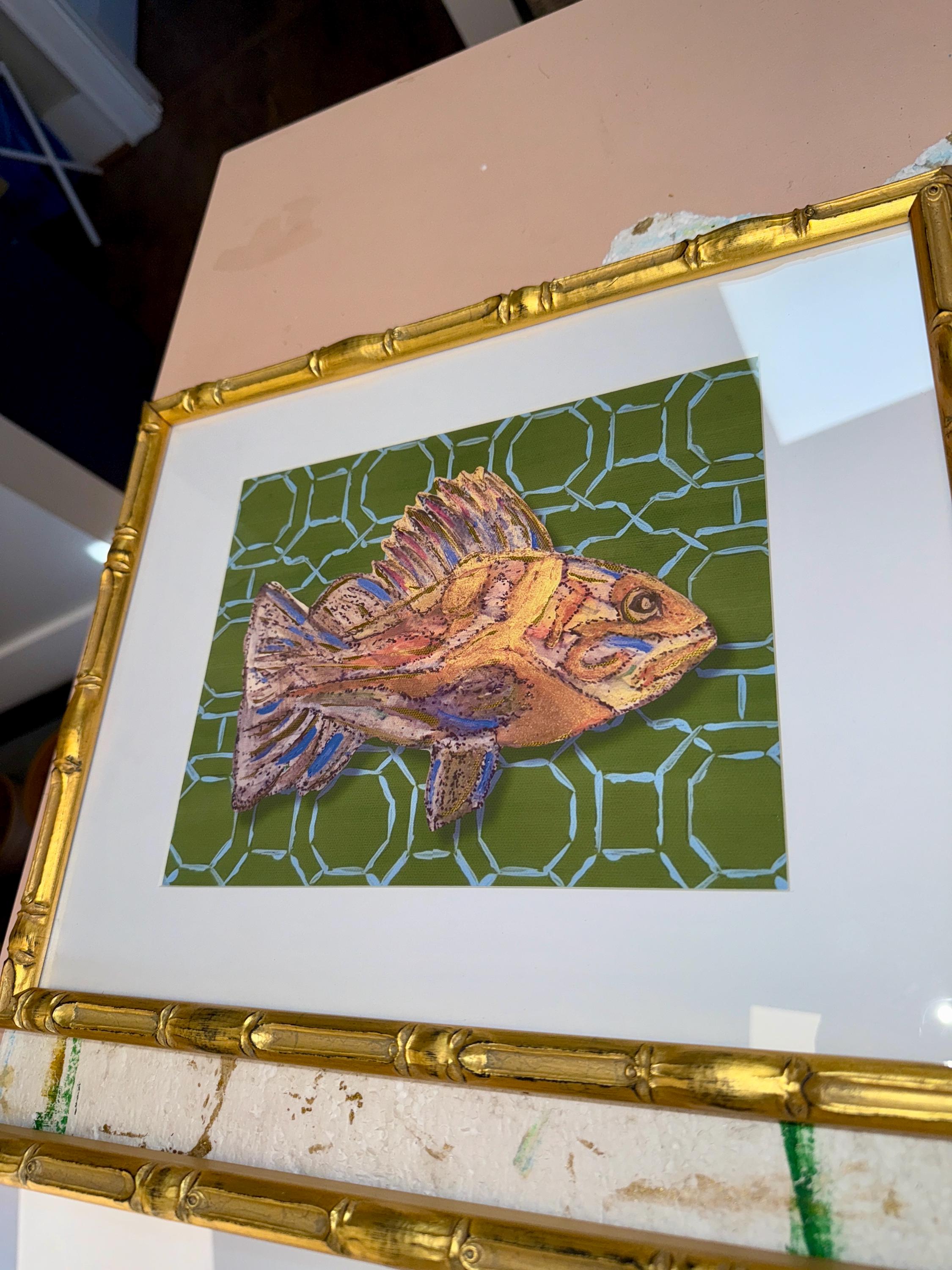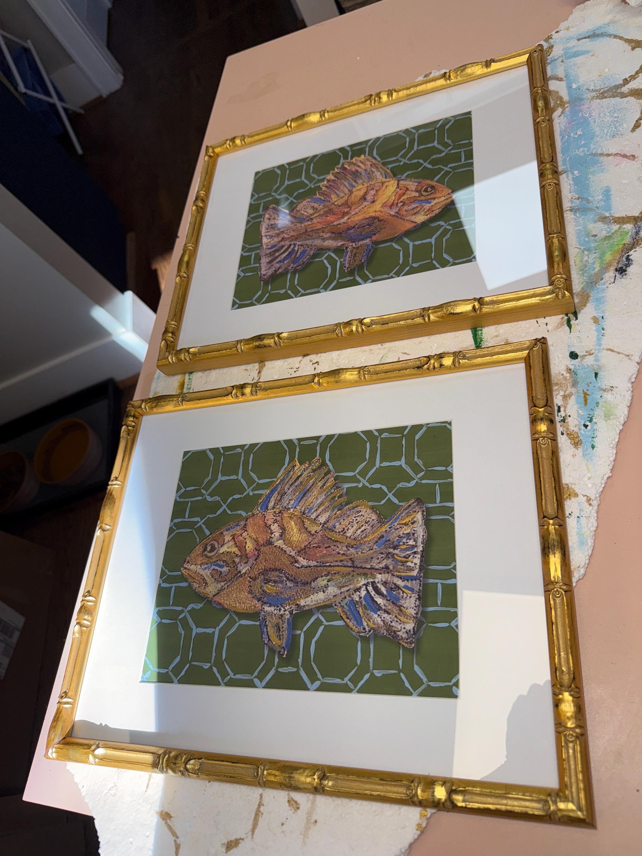 This listing is for the pair of “CHINOIS FISH” fine art prints printed on 8x10 canvas paper; matted in white to 11x14; and then framed in wooden gold bamboo frames to 12x15 each (horizontally formatted). Each one is matted in a single bevel white mat from 8x10 to 11x14. These frames are exquisite and come ready to hang with sawtooth hanger and real glass fronts (not plexi).