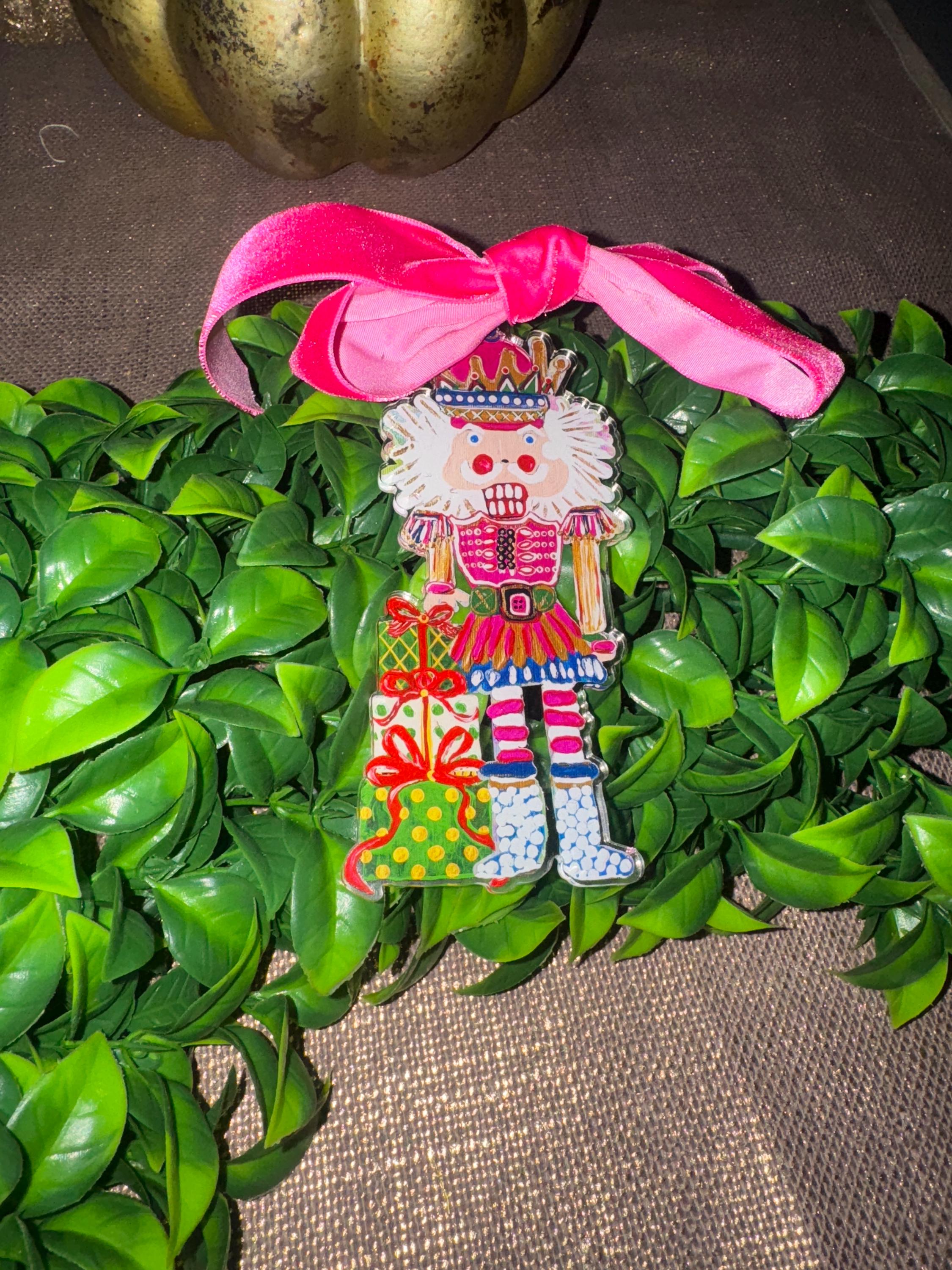 This listing is for a single ornament made from acrylic and from my personal artwork of a nutcracker with gifts. Each one is 3”W x 5”H x 0.2”D with a plush velvet hot pink ribbon/bow.