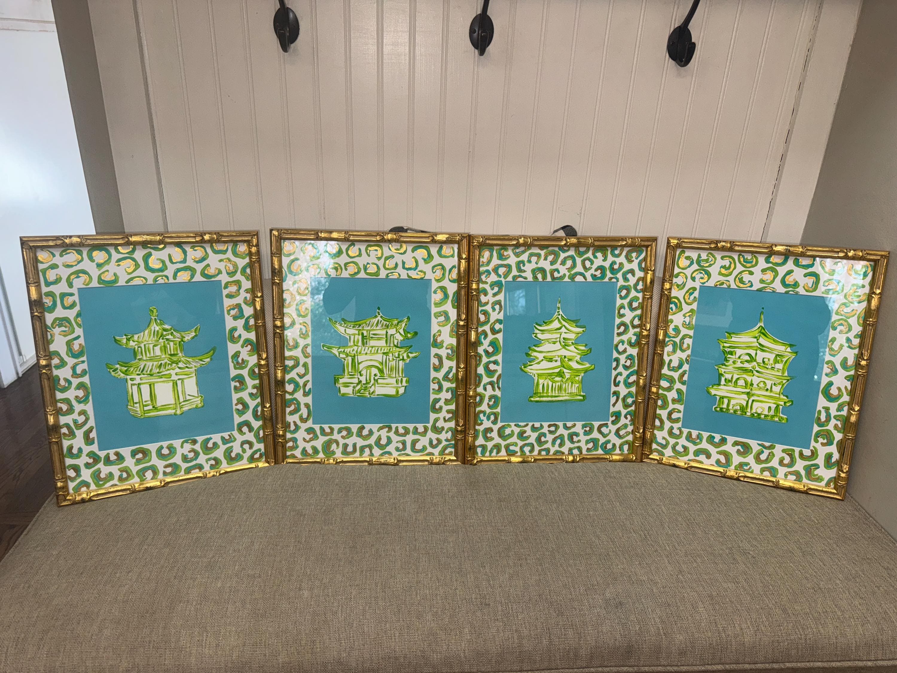 Pagoda Prints Set: Hand-Painted Leopard Mats, Gold Bamboo Frames