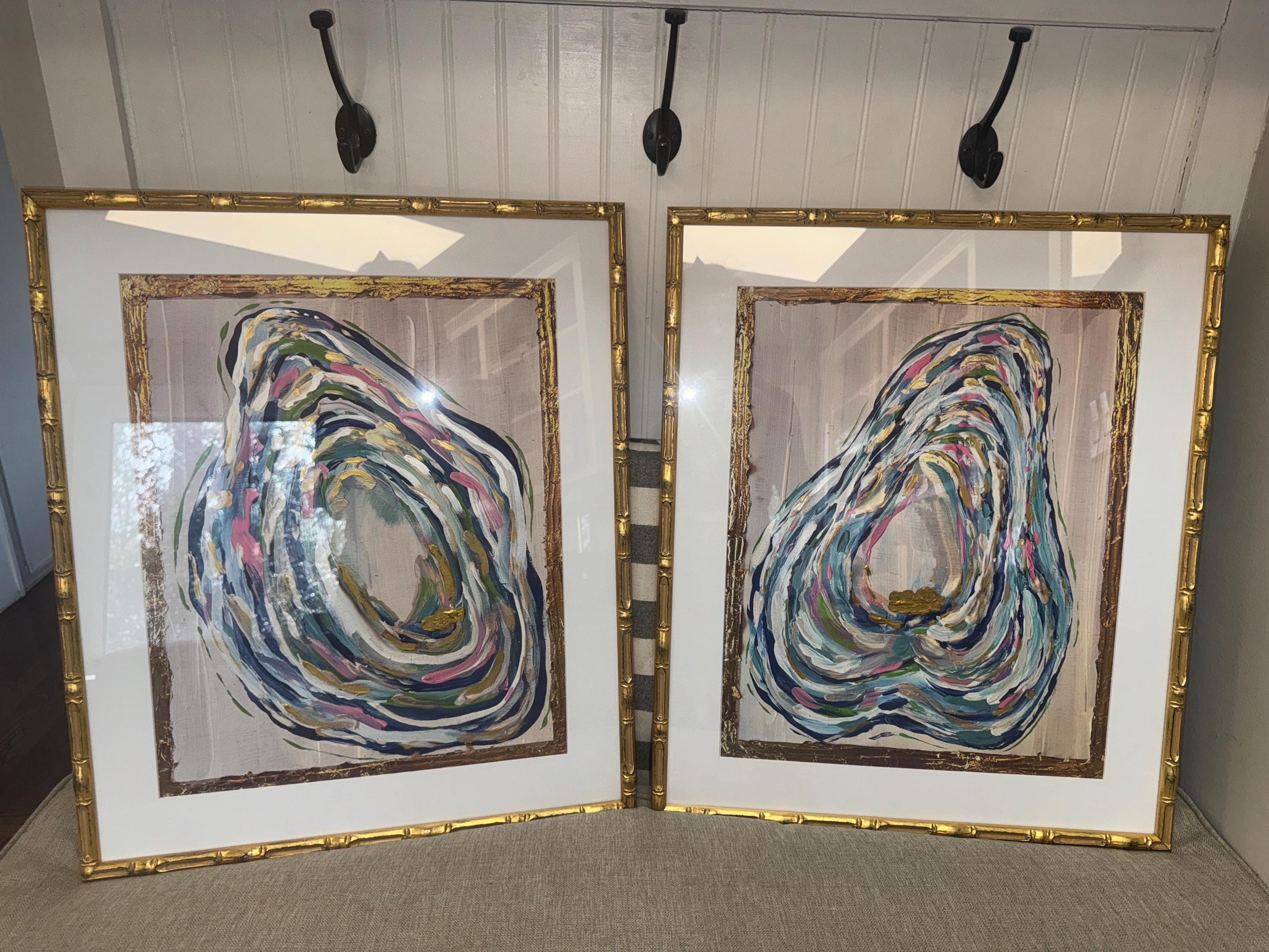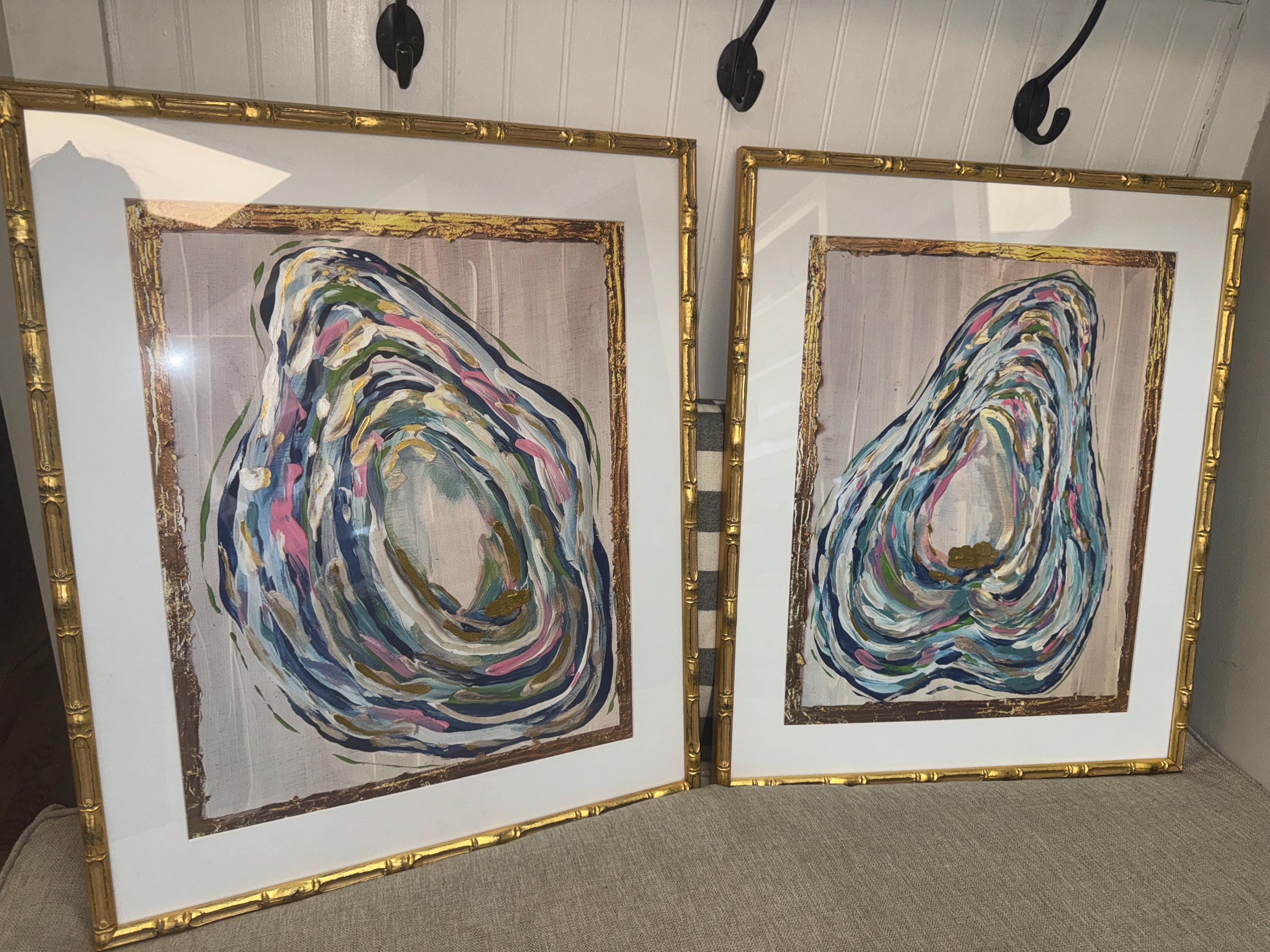 This listing is for the pair of extra large (overall dims of 22x26x2 each) framed Gilded Gold Oysters.