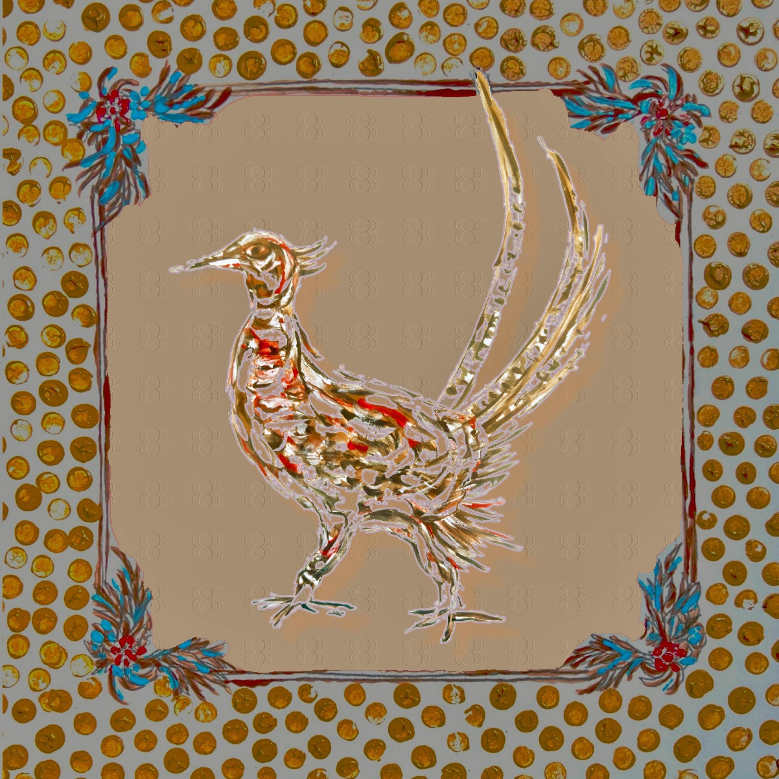 Pair of Fine Art Canvas Paper Gicleè Print Golden Pheasants with Dot Border Framed in Gilded Gold Beaded Wooden Frames
