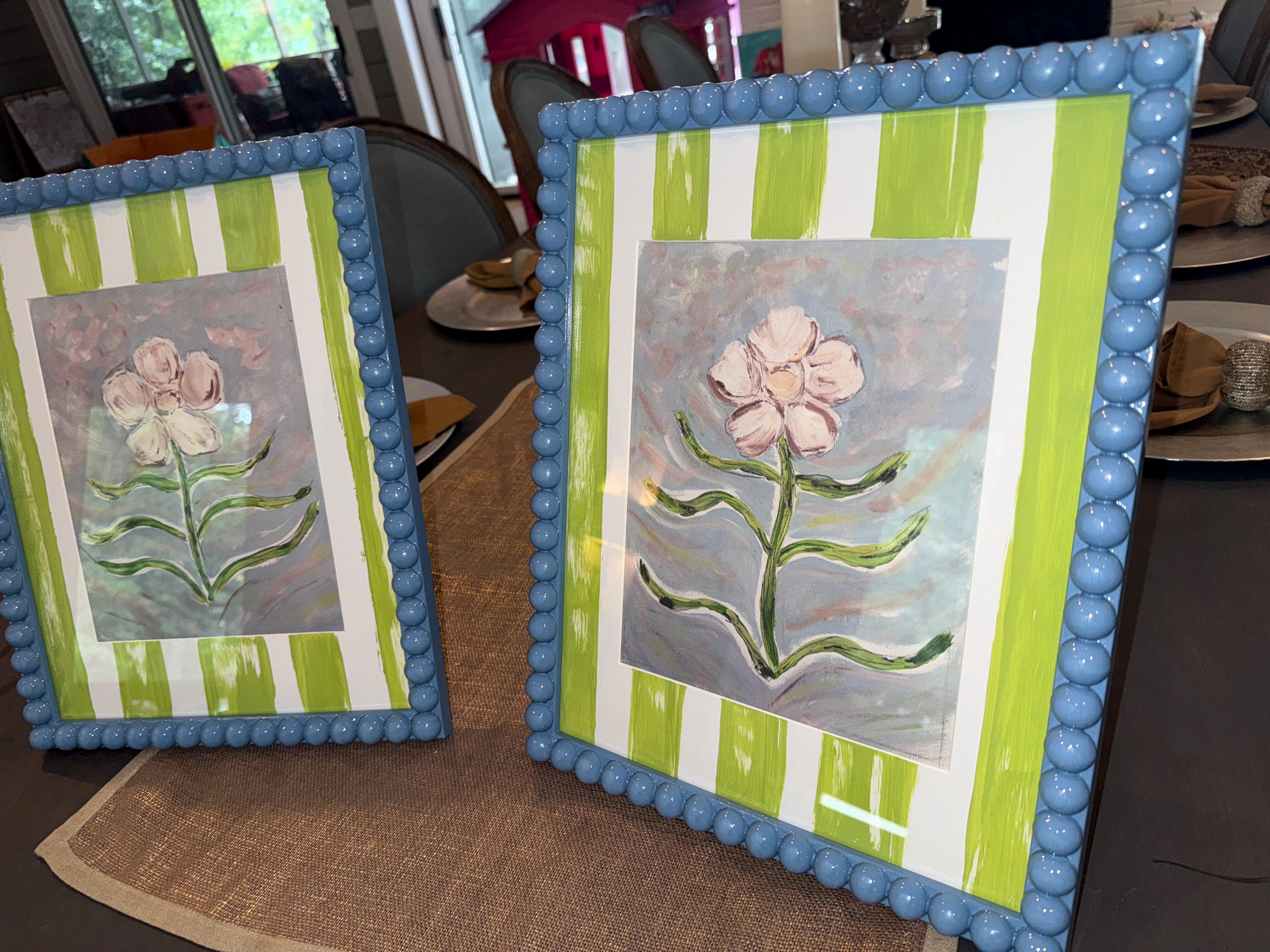 Floral Botanical Prints: Matted in Striped Hand-Painted Frames (Set of 2)