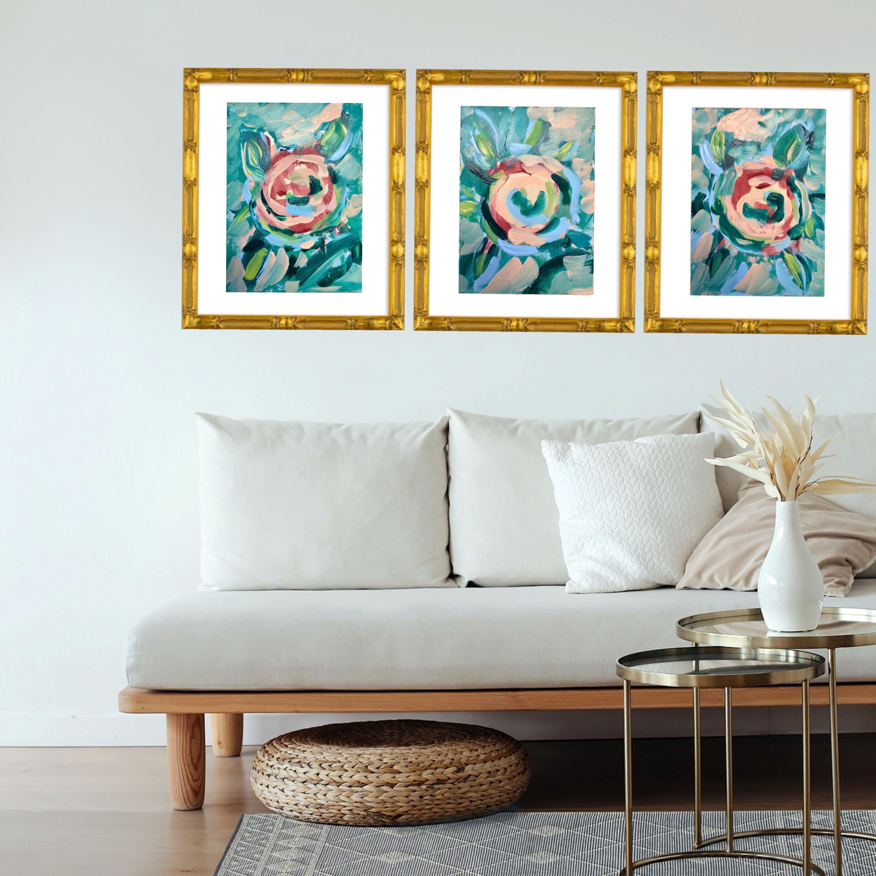 This listing is for the set of three fine art pieces titled “Abstract Florals” sized at overall framed dims of 17x21 each.