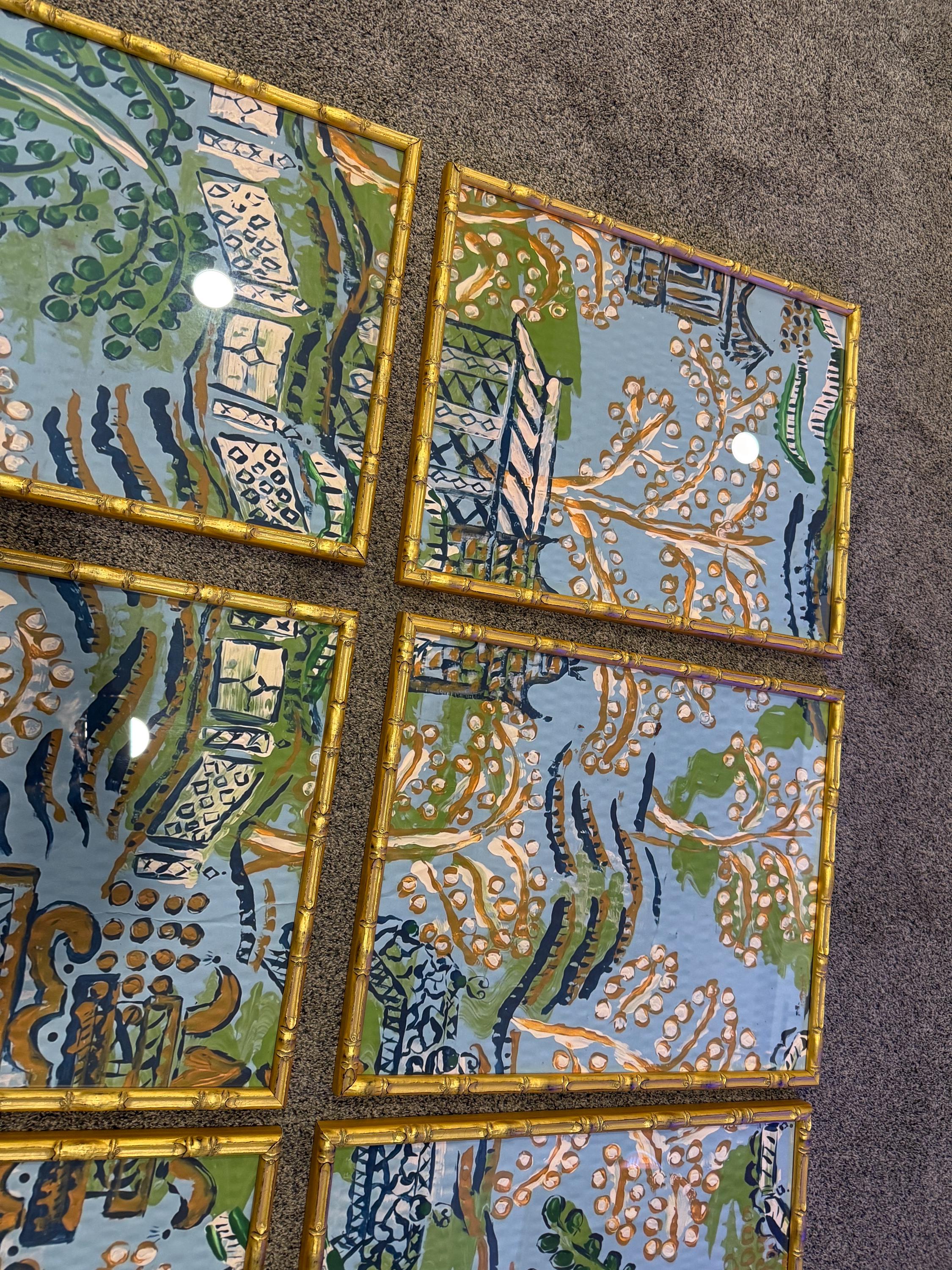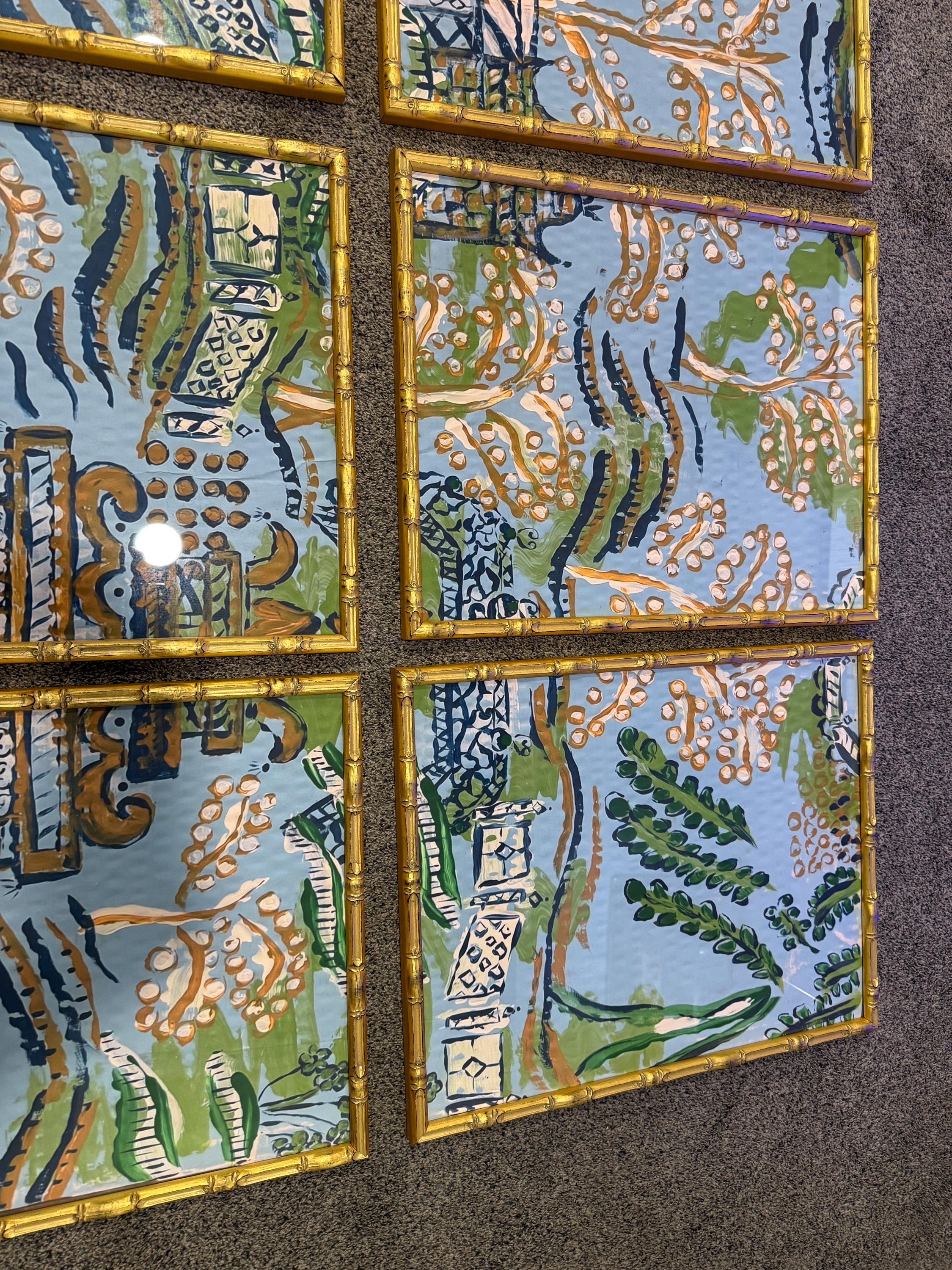 Framed in these exquisite 14k gilded gold leaf, wooden bamboo frames with real glass fronts (not the cheaper plexi option). These come ready to hang with metal sawtooth hangers on the back. Overall framed dims are 13x17x1.25 of each.
