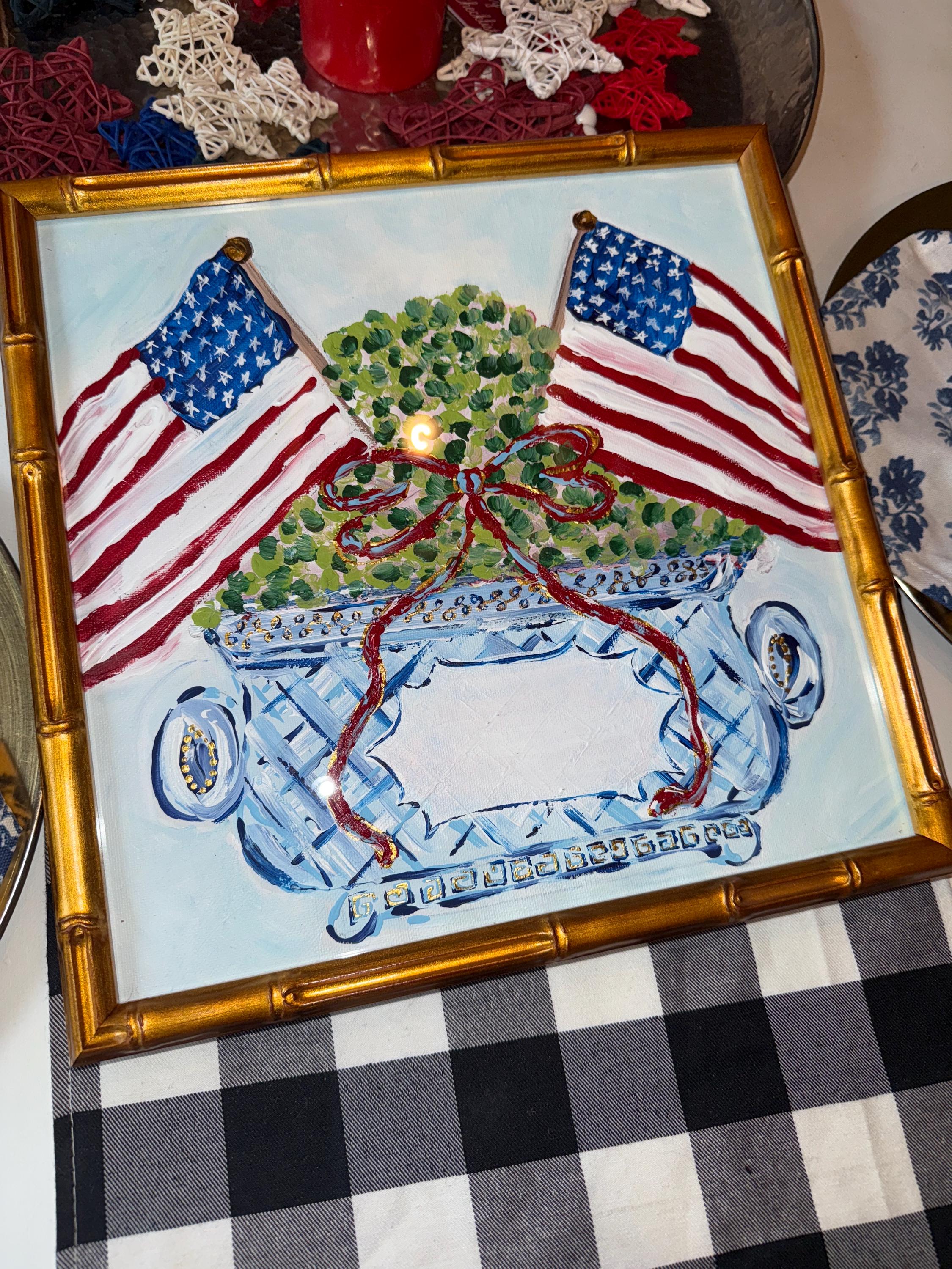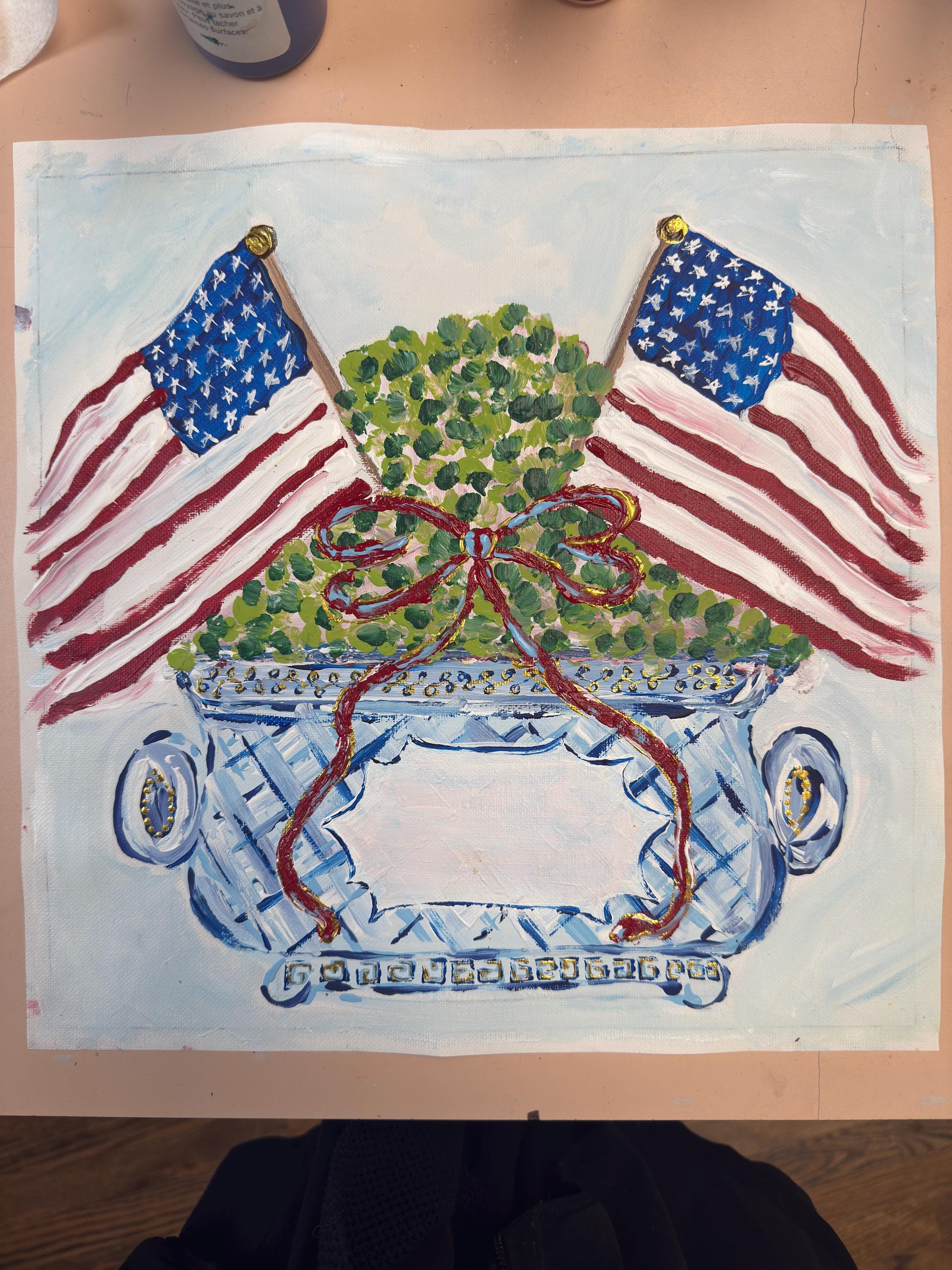 This listing is for the personalized Americana Topiary Fine Art Canvas Paper Original Painting sized at 12x12 painted on premium cotton duck; rag linen canvas paper.