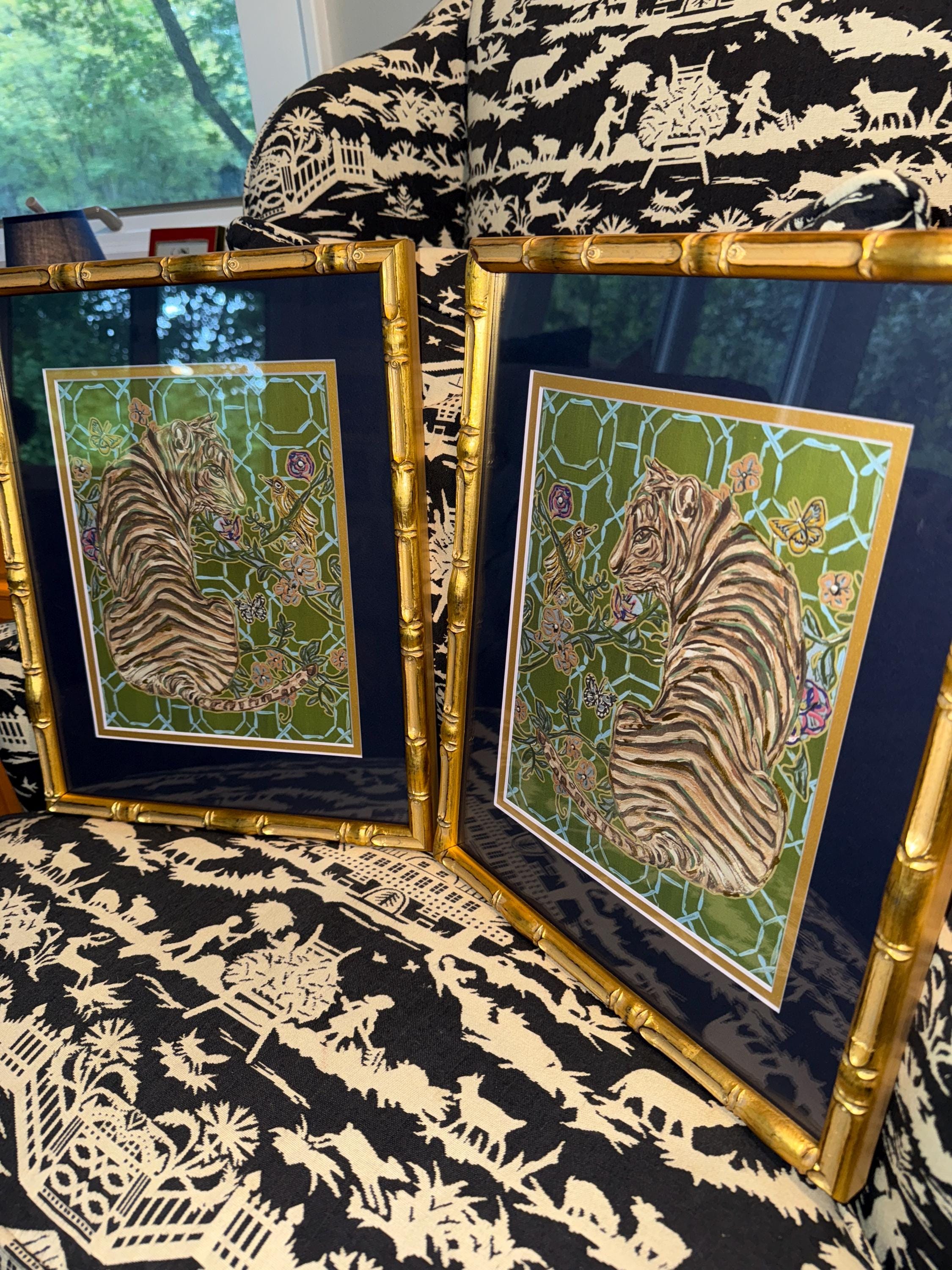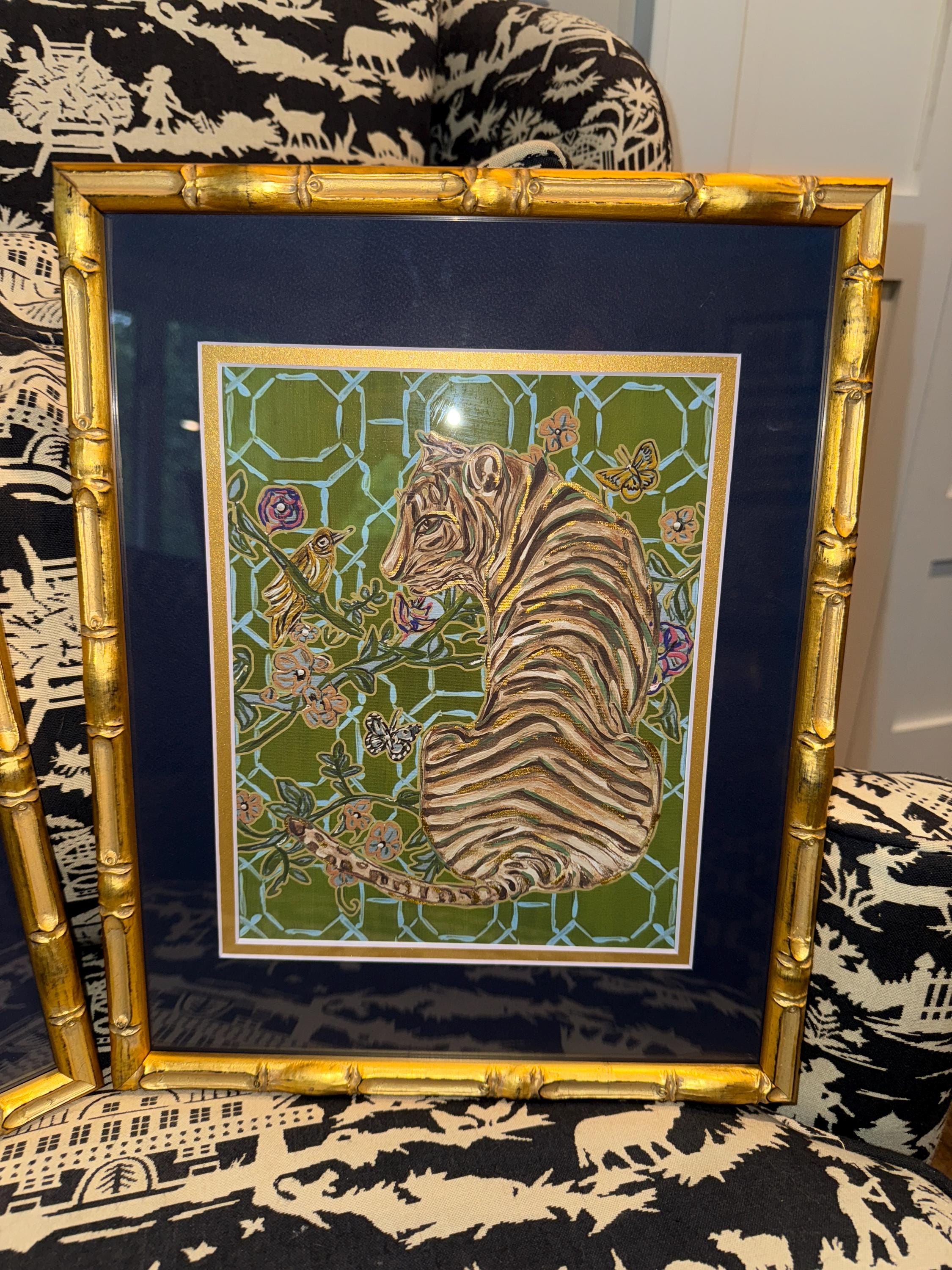 This listing is for the pair of fine art ‘Chinois Tigress’ prints on durable canvas paper double matted in navy and gold to 11x14 size; image size of 8x10 and then framed in these exquisite gold bamboo frames with glass fronts at 12x15. These come ready to hang with a single sawtooth hanger on each frame! I go back over each print with accents of 14k liquid gold paint (see video).
