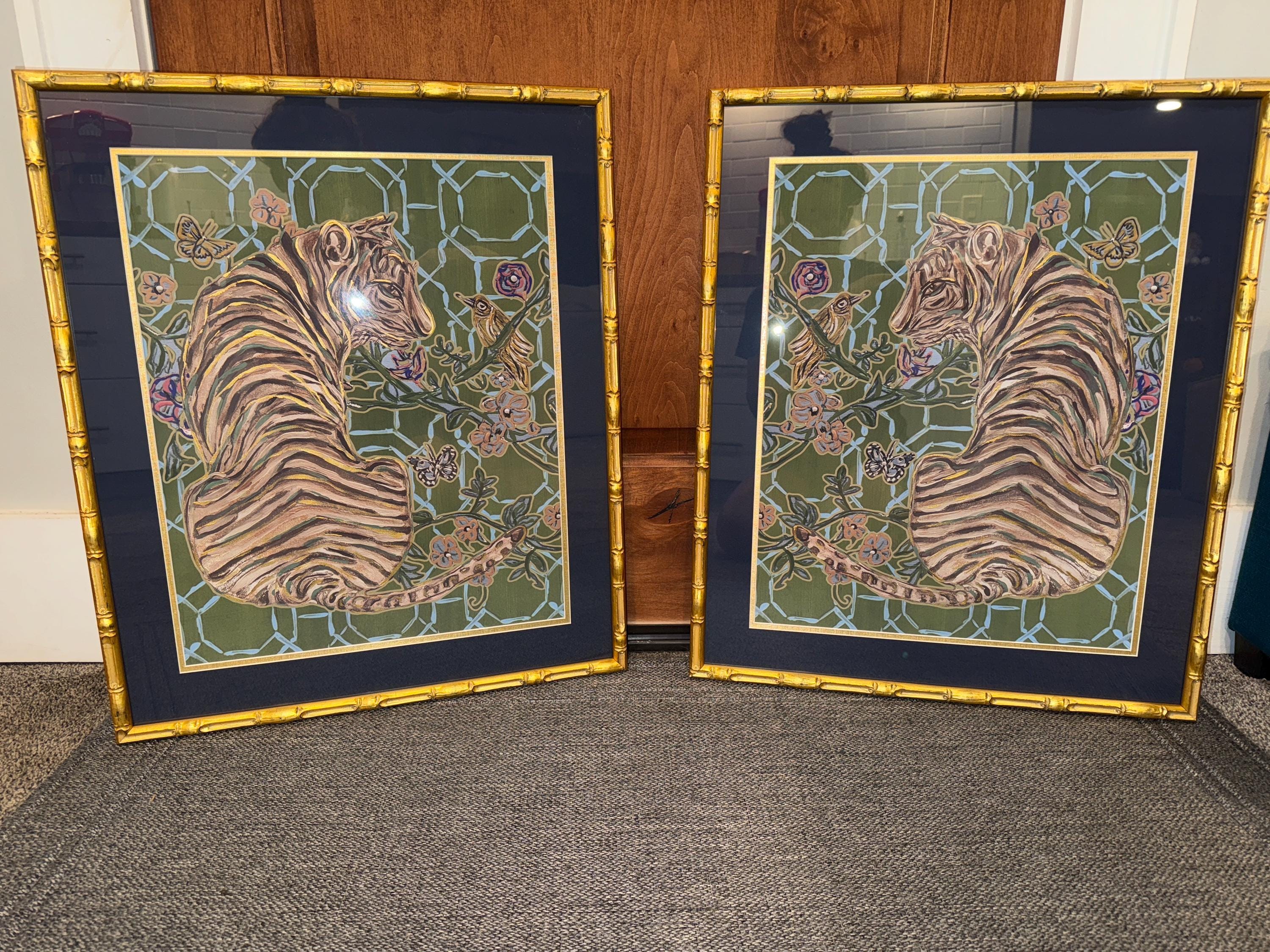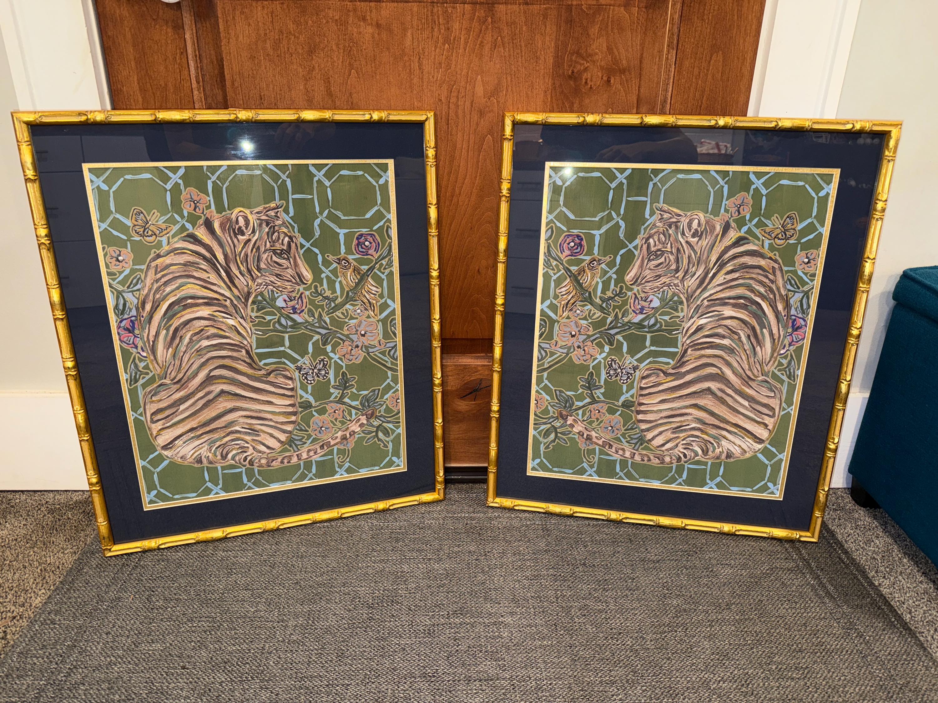 LARGE Pair of Chinois Tigress Prints Double Matted and Framed in Gilded Gold Bamboo Frames