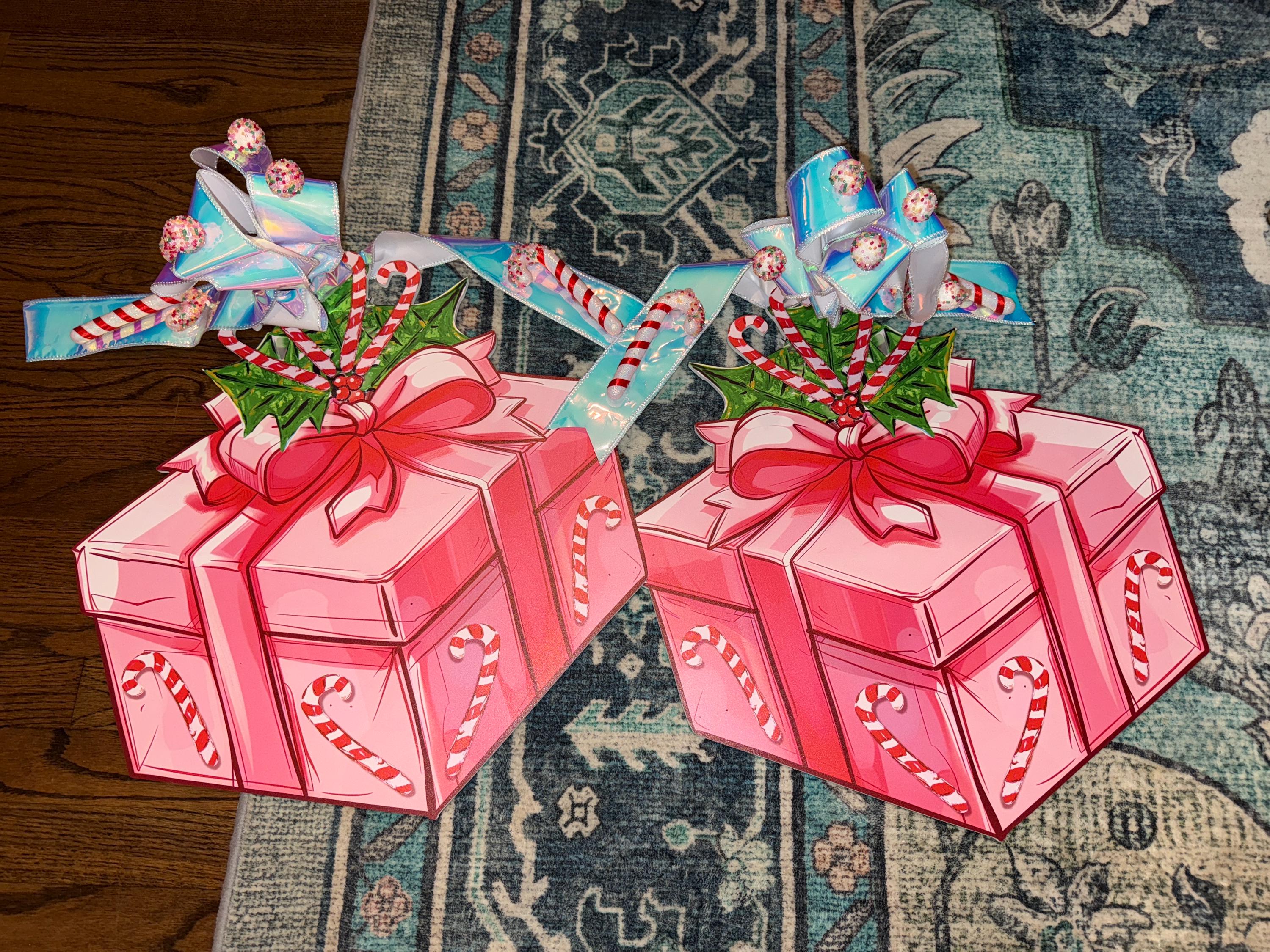 This listing is for the pair of Pretty Pink Peppermint Present door hangers sized at 21” height by 19” width. These are made from 6mm PVC composite board.