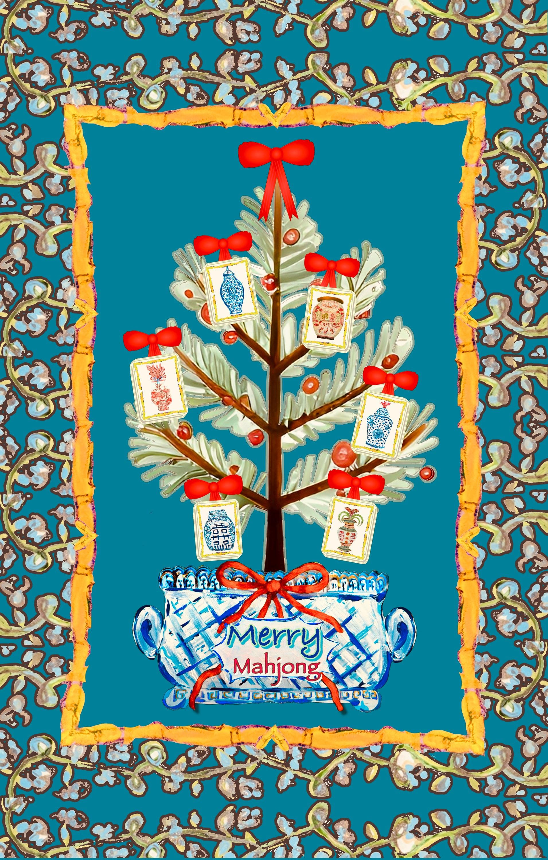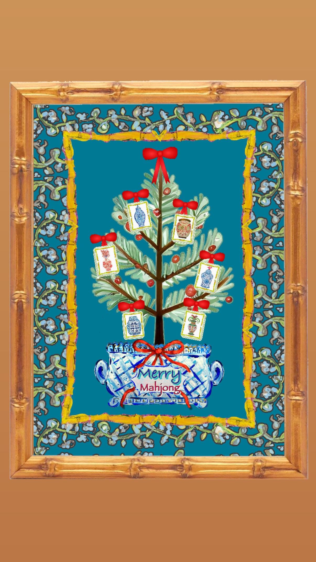 Single Fine Art Merry Mahjong Festive Christmas Print Framed in Gilded Gold Leaf Wooden Bamboo Frame