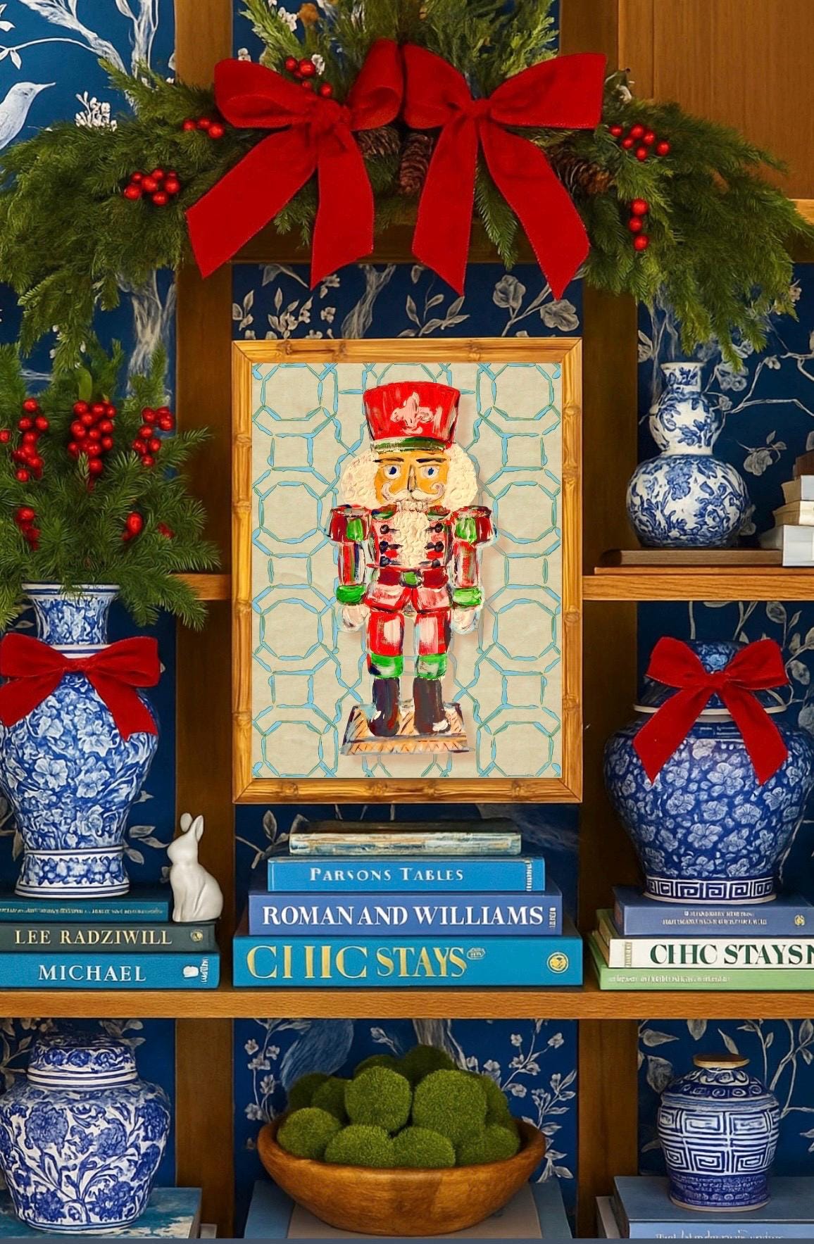 Single Fine Art Fleur de Lis Festive Nutcracker Christmas Print Framed in Gilded Gold Leaf Wooden Bamboo Frame