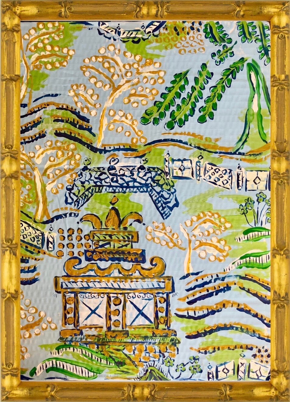 Chinoiserie Pagoda Landscape Prints: Gilded Bamboo Frames, Set of 2 (COMES UNFRAMED as prints only)